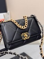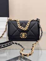 This is a replica CHANEL 19 Wallet on Chain Shiny Lambskin, Gold-Tone, Silver-Tone & Ruthenium-Finish Metal in Black . Interlocking CC Logo, Quilted Pattern & Chain-Link Accent.