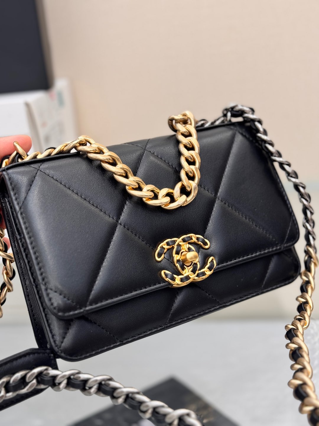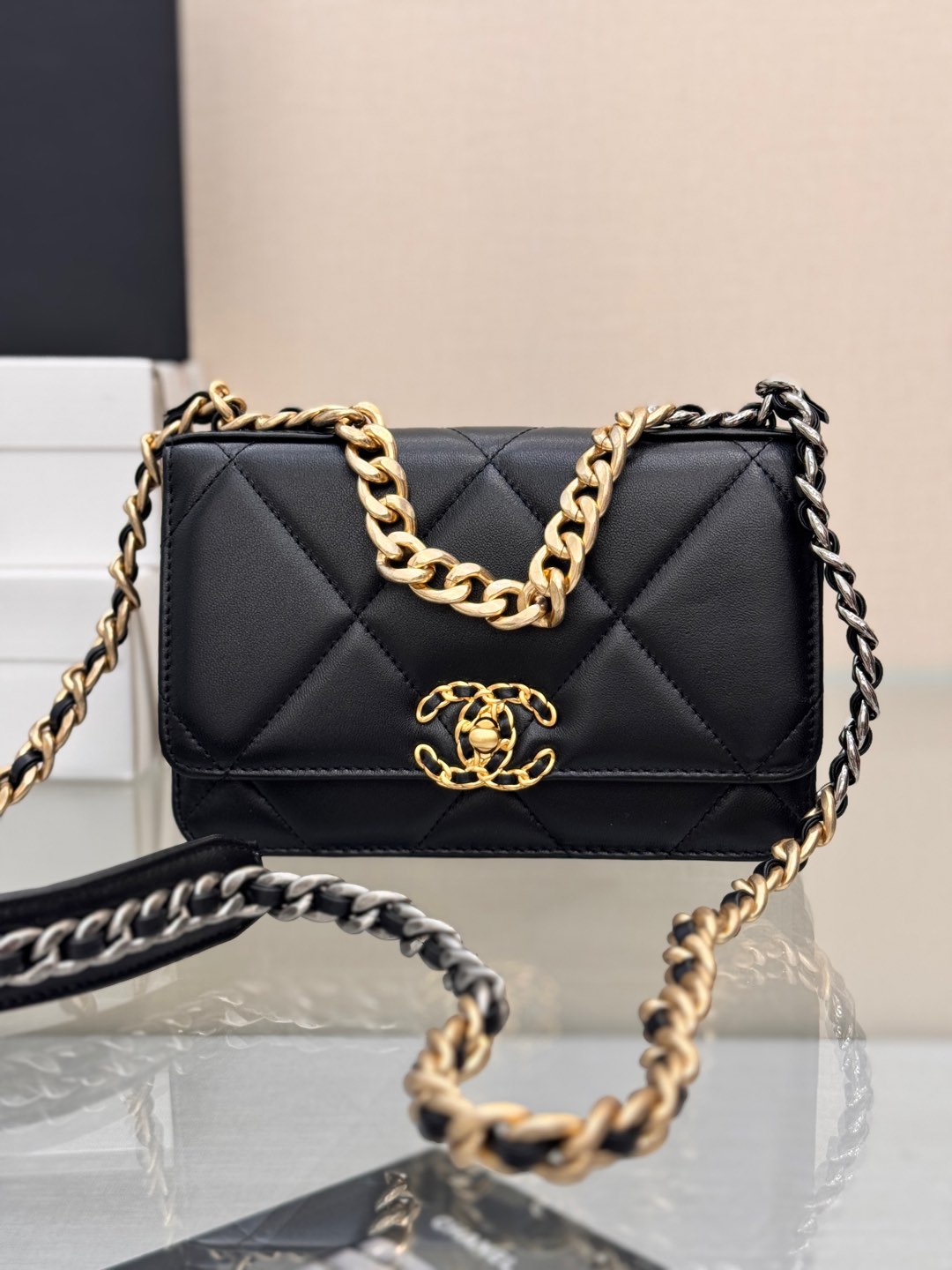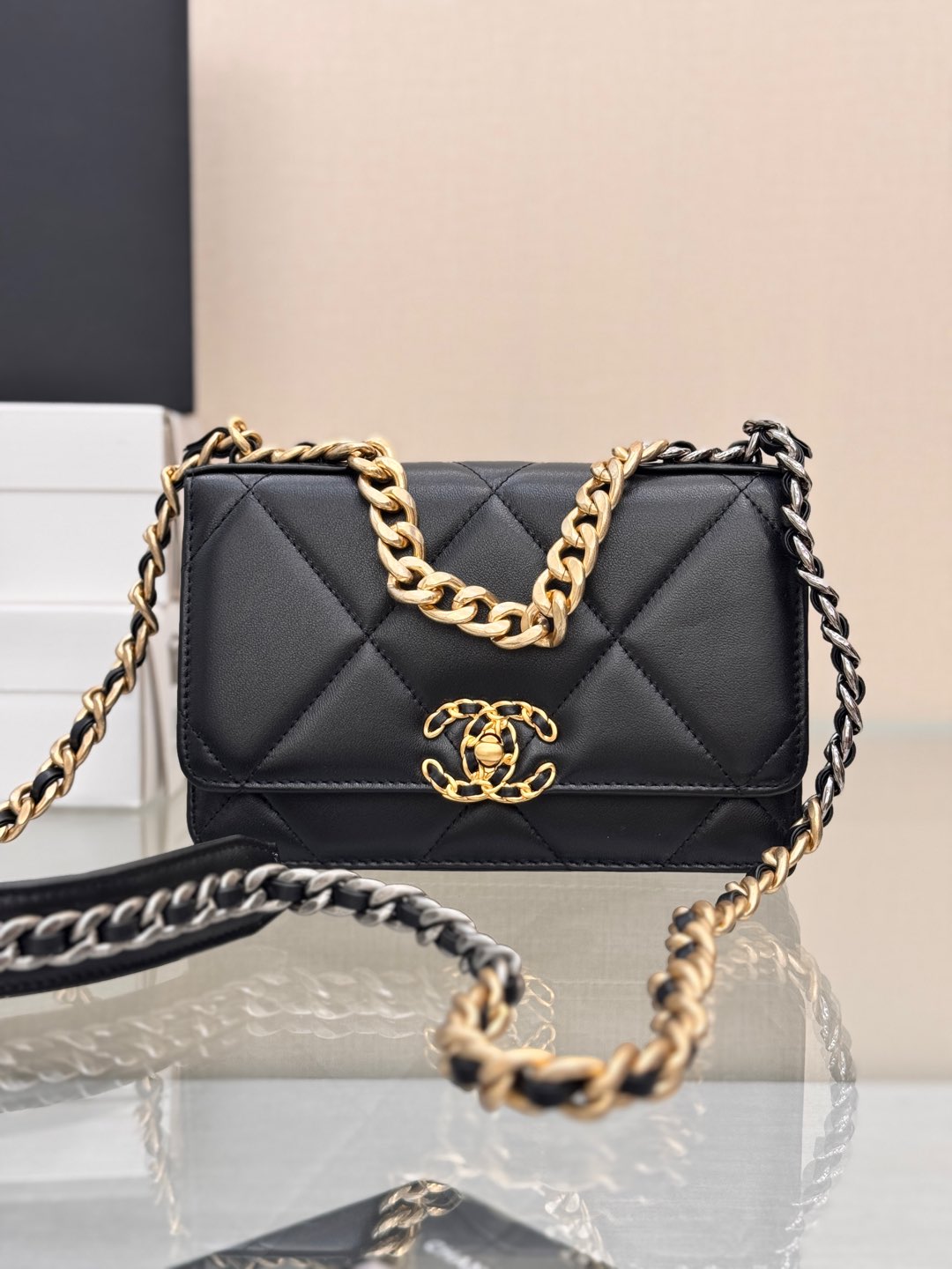 CHANEL 19 Wallet on Chain Shiny Lambskin, Gold-Tone, Silver-Tone & Ruthenium-Finish Metal