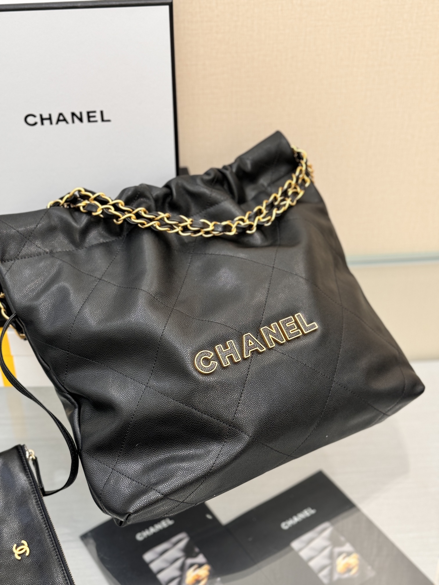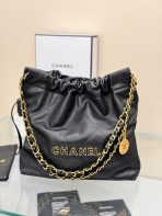 This is a replica CHANEL 22 Small Handbag Shiny Calfskin & Gold-Tone Metal in Black. From the Cruise 2025 Collection by Virginie Viard, this small 22 bag comes in shiny calfskin,,Size: Small ,