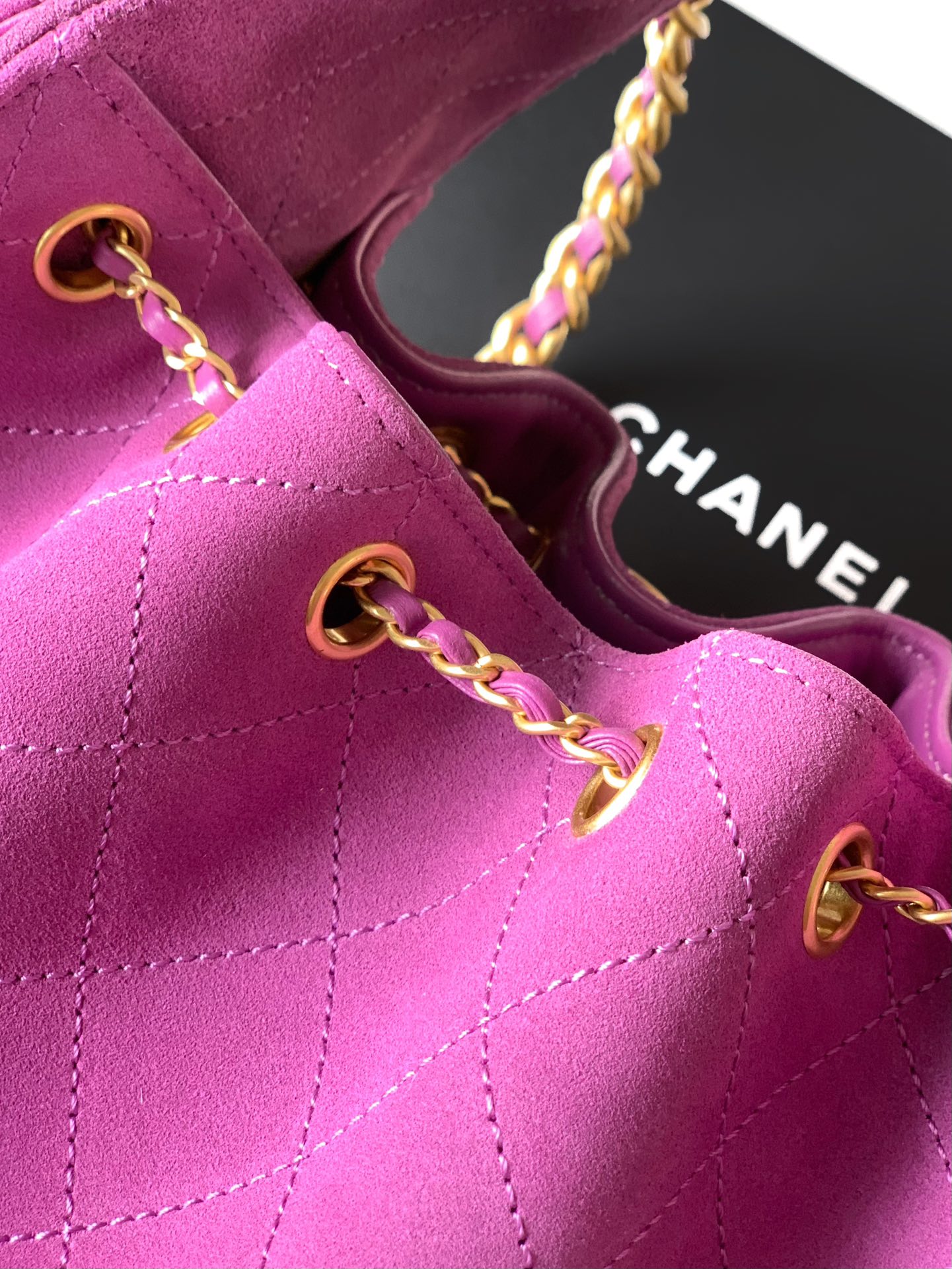 This is a replica CHANEL 25 Small Handbag.  Material: Suede Calfskin & Gold-Tone Metal Dimensions:  Reference: