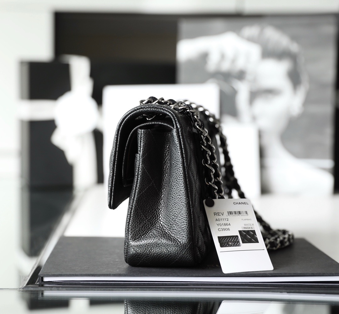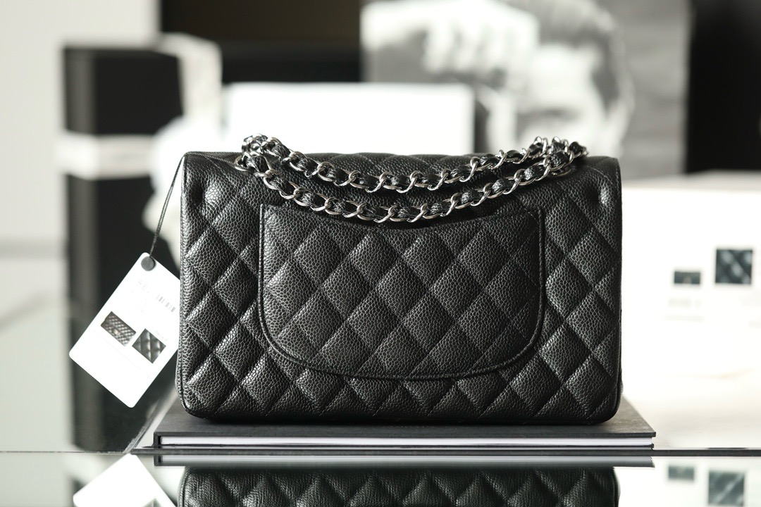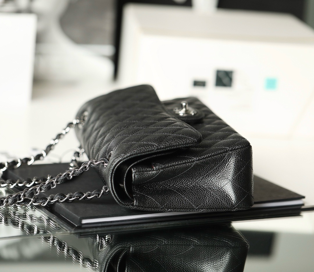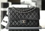 This is a replica CHANEL Classic 11.12 Flap Bag Lambskin & Silver-Tone Metal Black. This classic double flap bag comes in black grained calfskin featuring gold-tone hardware. Open pocket on the back. Closes with classic CC-turn-lock on the front. Zipper pocket inside the flap. Outside pocket on the front under the flap. Lined in burgundy leather with two open and a lipstick pocket against the back. CC stitching on the inside flap.  Size