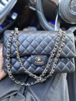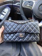 This is a replica CHANEL Classic 11.12 Flap Bag Lambskin & Gold-Tone Metal in Black. This classic double flap bag comes in smooth black lambskin featuring gold-tone hardware. Open pocket on the back. Closes with classic CC-turn-lock on the front. Zipper pocket inside the flap. Outside pocket on the front under the flap. A lipstick pocket against the back. CC stitching on the inside flap. ,Size,