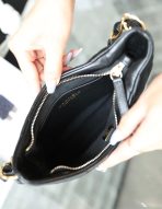 This is a replica CHANEL Hobo Handbag Shiny Lambskin & Gold-Tone Metal in Black. This hobo handbag comes in shiny caviar calfskin with gold hardware and has tonal stitching, signature CC on front of bag, zip top closure and an interwoven brushed gold chain woven with black leather. The interior is lined in a black fabric with one zip pocket and one slip pocket on the rear wall.