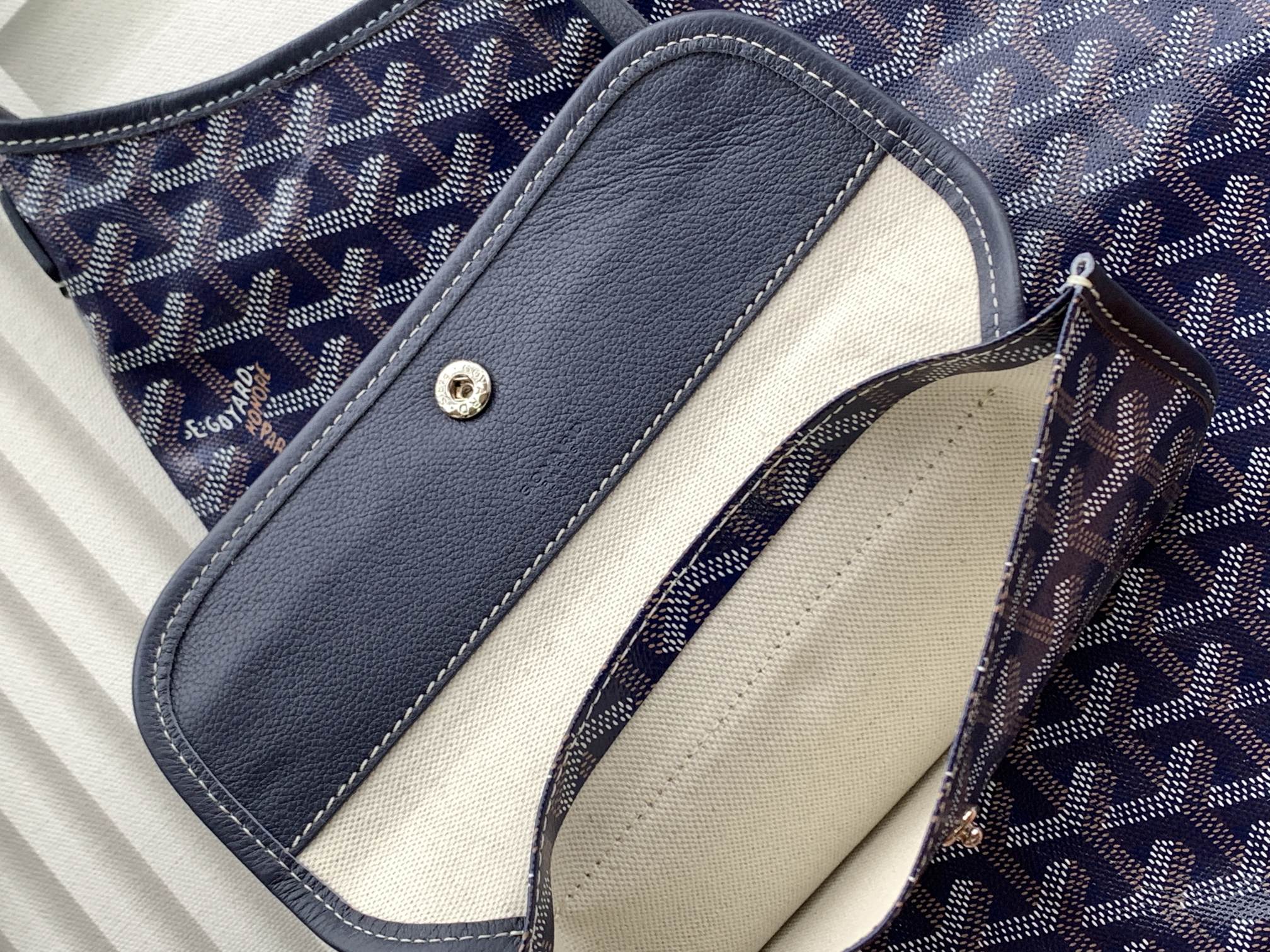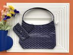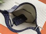 This is a replica GOYARD Bohème Hobo Bag in navy blue. The Bohème Hobo bag epitomizes lightness, flexibility, and safety thanks to its zip closure. It is very comfortable as a shoulder bag thanks to its wide handle. It also features the emblematic removable pouch that closes with a snap fastener.,
