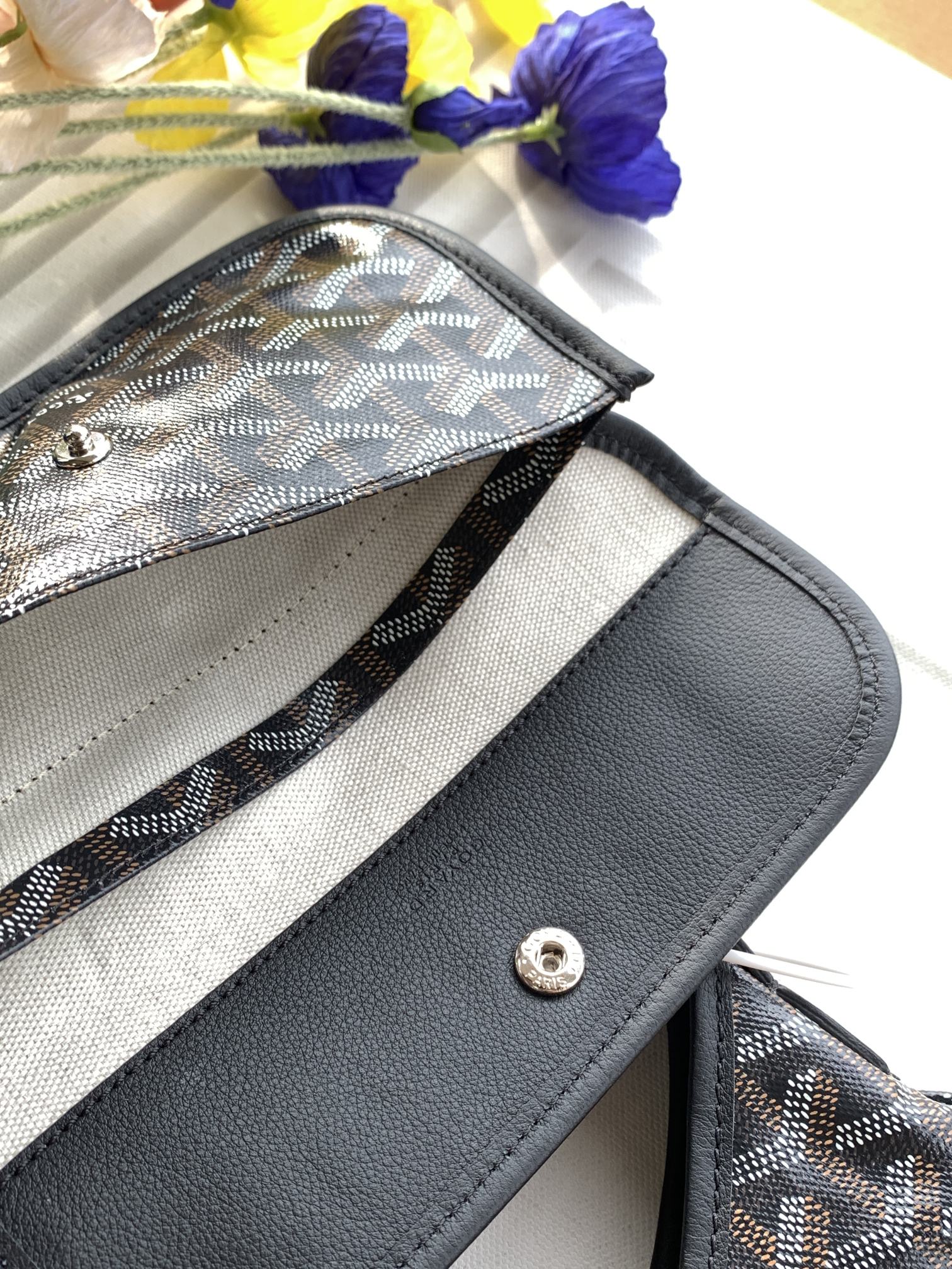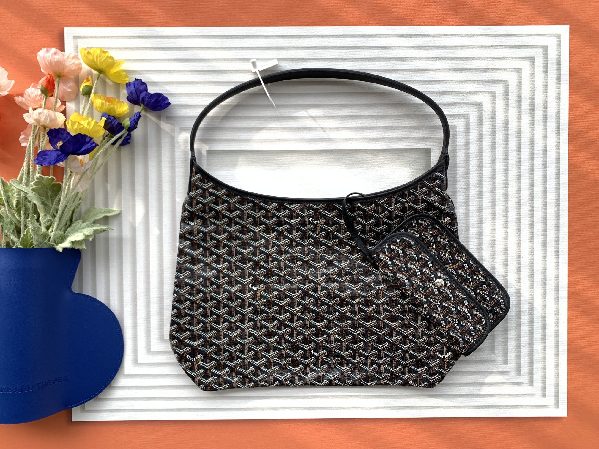This is a replica GOYARD Bohème Hobo Bag in black. The Bohème Hobo bag epitomizes lightness, flexibility, and safety thanks to its zip closure. It is very comfortable as a shoulder bag thanks to its wide handle. It also features the emblematic removable pouch that closes with a snap fastener.,