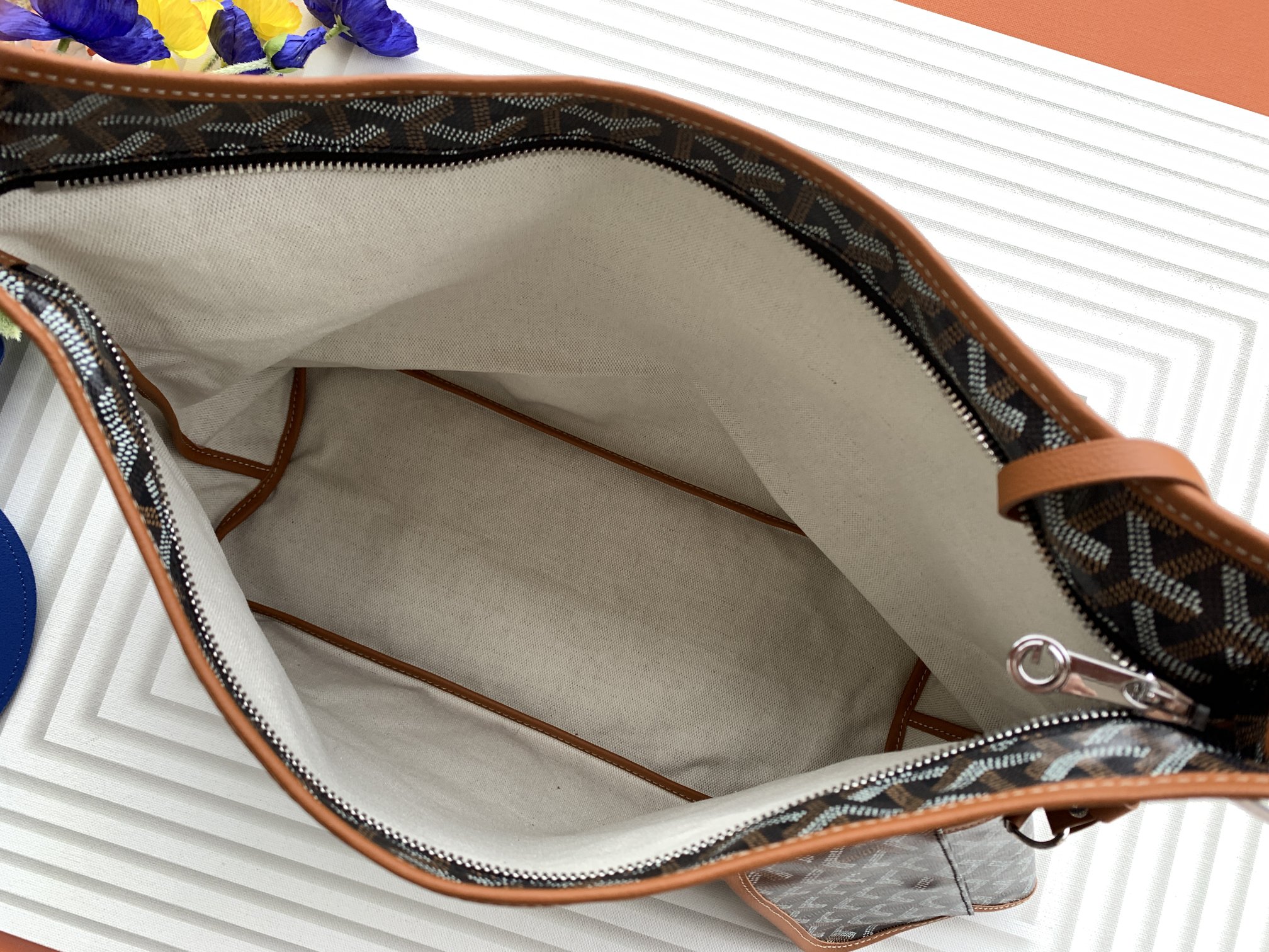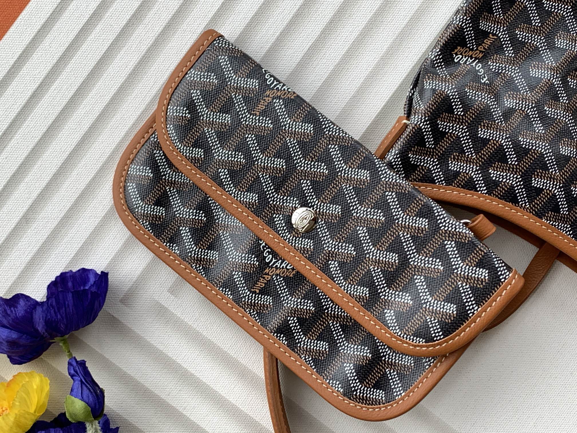 This is a replica GOYARD Bohème Hobo Bag in black and tan. The Bohème Hobo bag epitomizes lightness, flexibility, and safety thanks to its zip closure. It is very comfortable as a shoulder bag thanks to its wide handle. It also features the emblematic removable pouch that closes with a snap fastener.,