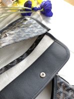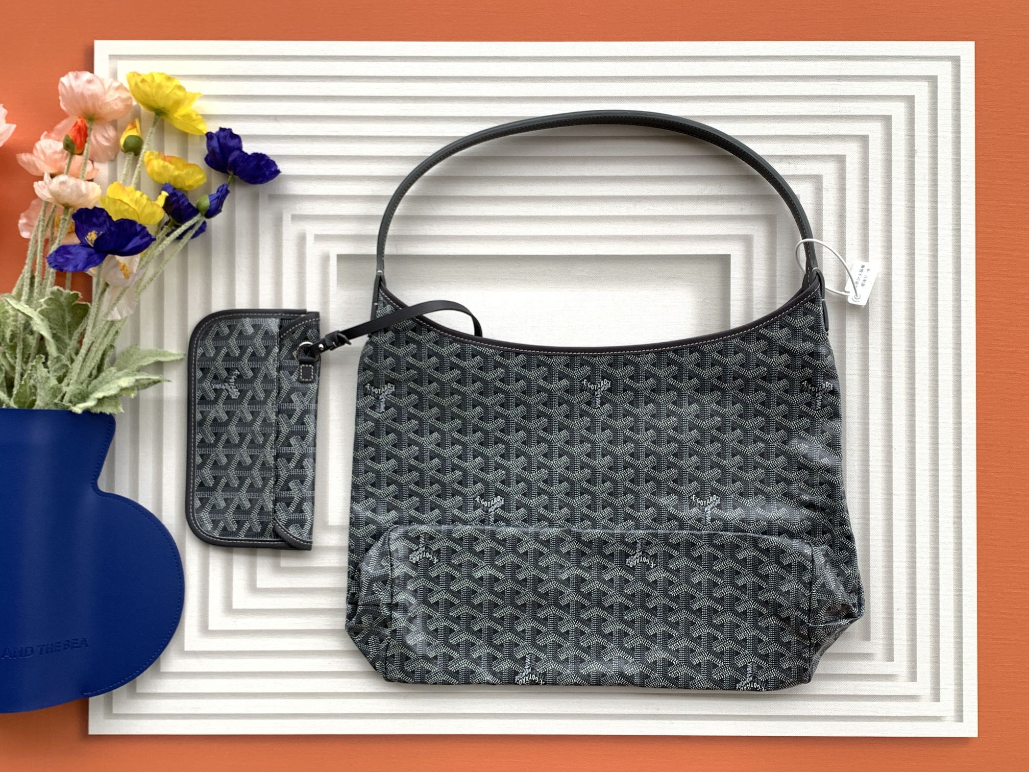 This is a replica GOYARD Bohème Hobo Bag in grey. The Bohème Hobo bag epitomizes lightness, flexibility, and safety thanks to its zip closure. It is very comfortable as a shoulder bag thanks to its wide handle. It also features the emblematic removable pouch that closes with a snap fastener.,