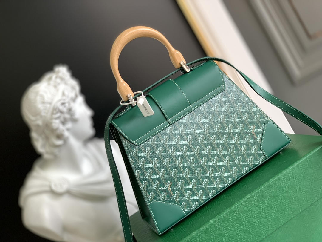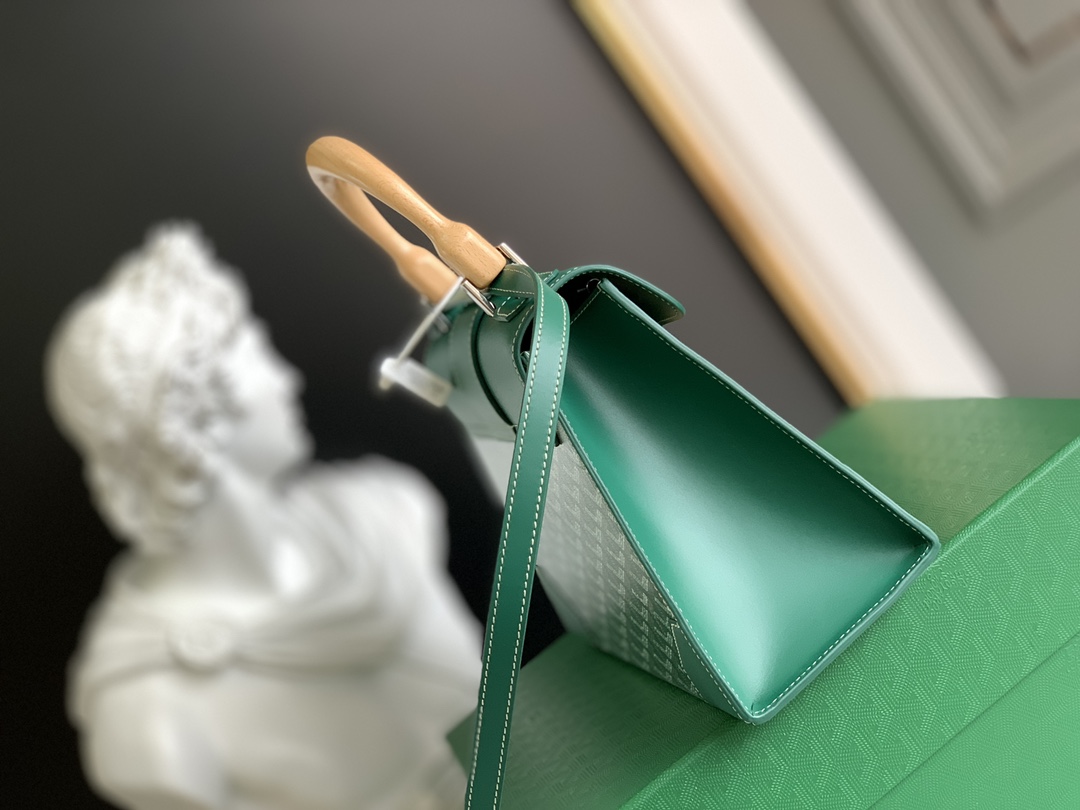 This is a replica GOYARD Saïgon PM Bag in green. The Saïgon bag is one of Maison Goyard’s emblematic pieces as it inherits all our trunk-making signature codes like the wood batons, leather corners and trunk rivets. In this structured PM format, the Saïgon bag can be worn with or without a strap for an elegant evening style.,