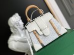 This is a replica GOYARD Saïgon PM Bag in white. The Saïgon bag is one of Maison Goyard’s emblematic pieces as it inherits all our trunk-making signature codes like the wood batons, leather corners and trunk rivets. In this structured PM format, the Saïgon bag can be worn with or without a strap for an elegant evening style.,
