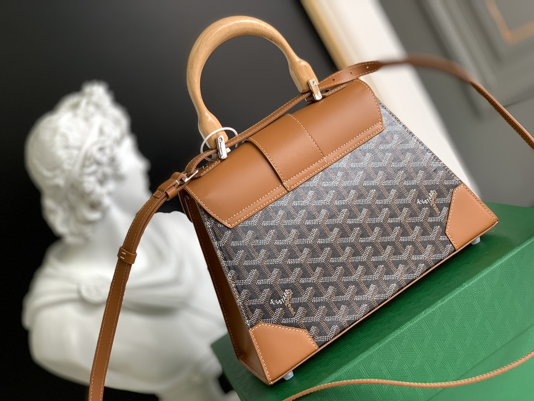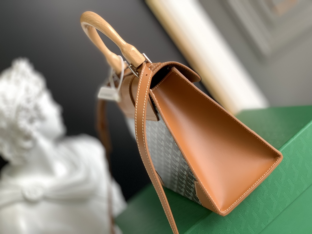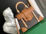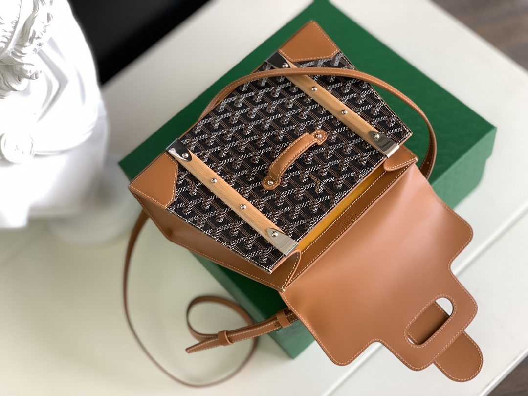 This is a replica GOYARD Saïgon PM Bag in black and tan. The Saïgon bag is one of Maison Goyard’s emblematic pieces as it inherits all our trunk-making signature codes like the wood batons, leather corners and trunk rivets. In this structured PM format, the Saïgon bag can be worn with or without a strap for an elegant evening style.,