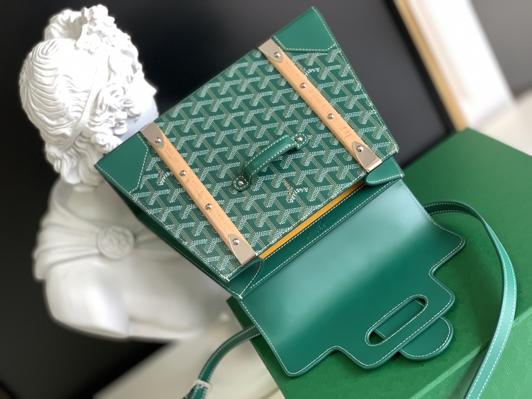 This is a replica GOYARD Saïgon PM Bag in green. The Saïgon bag is one of Maison Goyard’s emblematic pieces as it inherits all our trunk-making signature codes like the wood batons, leather corners and trunk rivets. In this structured PM format, the Saïgon bag can be worn with or without a strap for an elegant evening style.,