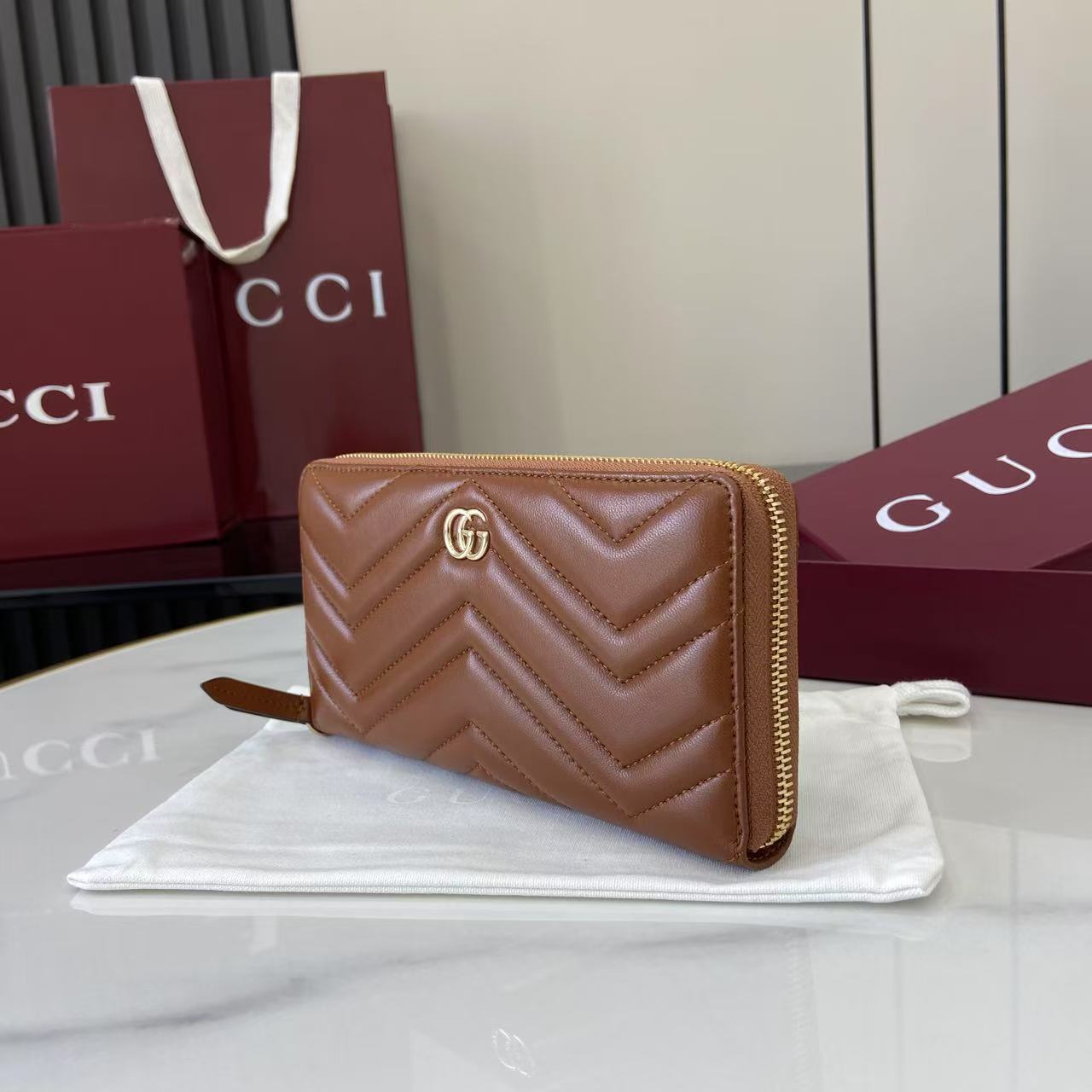 ,Brown matelassé chevron leather,Light gold-toned hardware,Brown taffeta lining,Double G,12 card slots and three bill compartments,Zip coin pocket,Zip around closure,Weight: 0.50lbs approximately,7.5″W x 4.1″H x .8″D