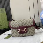 This is a replica GUCCI Horsebit 1955 Soft Small Shoulder Bag in beige and rosso ancora leather with contrast stitching. ,Size: Soft small,