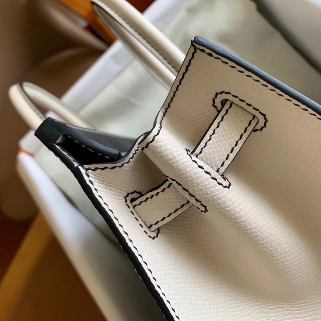 ###This Birkin is in ###Noir and Craie epsom leather with palladium hardware and has tonal stitching, front flap, two straps with center toggle closure, clochette with lock and two keys, and double rolled handles.###