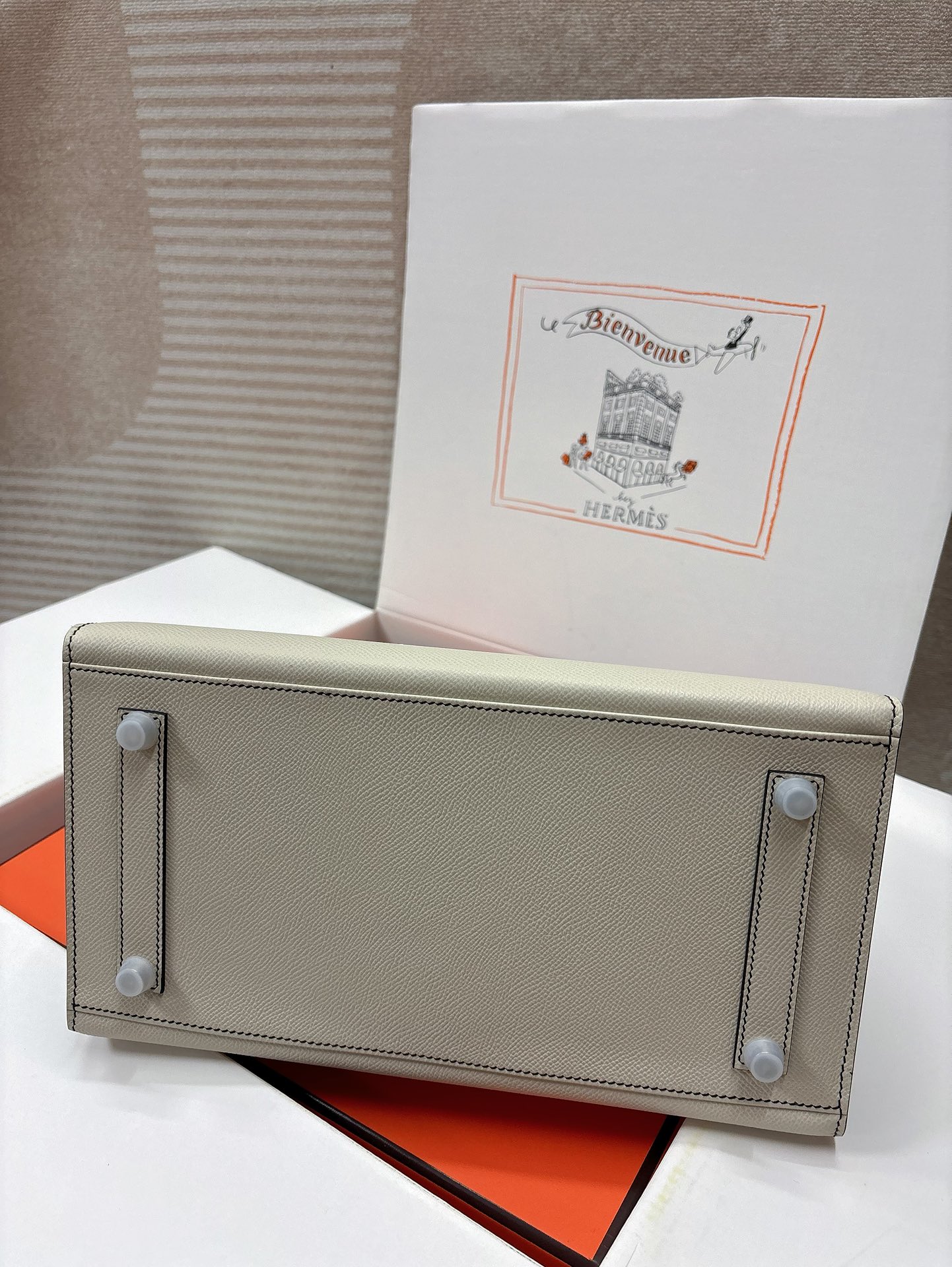 ###This Birkin is in Craie and black epsom leather with Palladium hardware and has tonal stitching, front flap, two straps with center toggle closure, clochette with lock and two keys, and double rolled handles.###