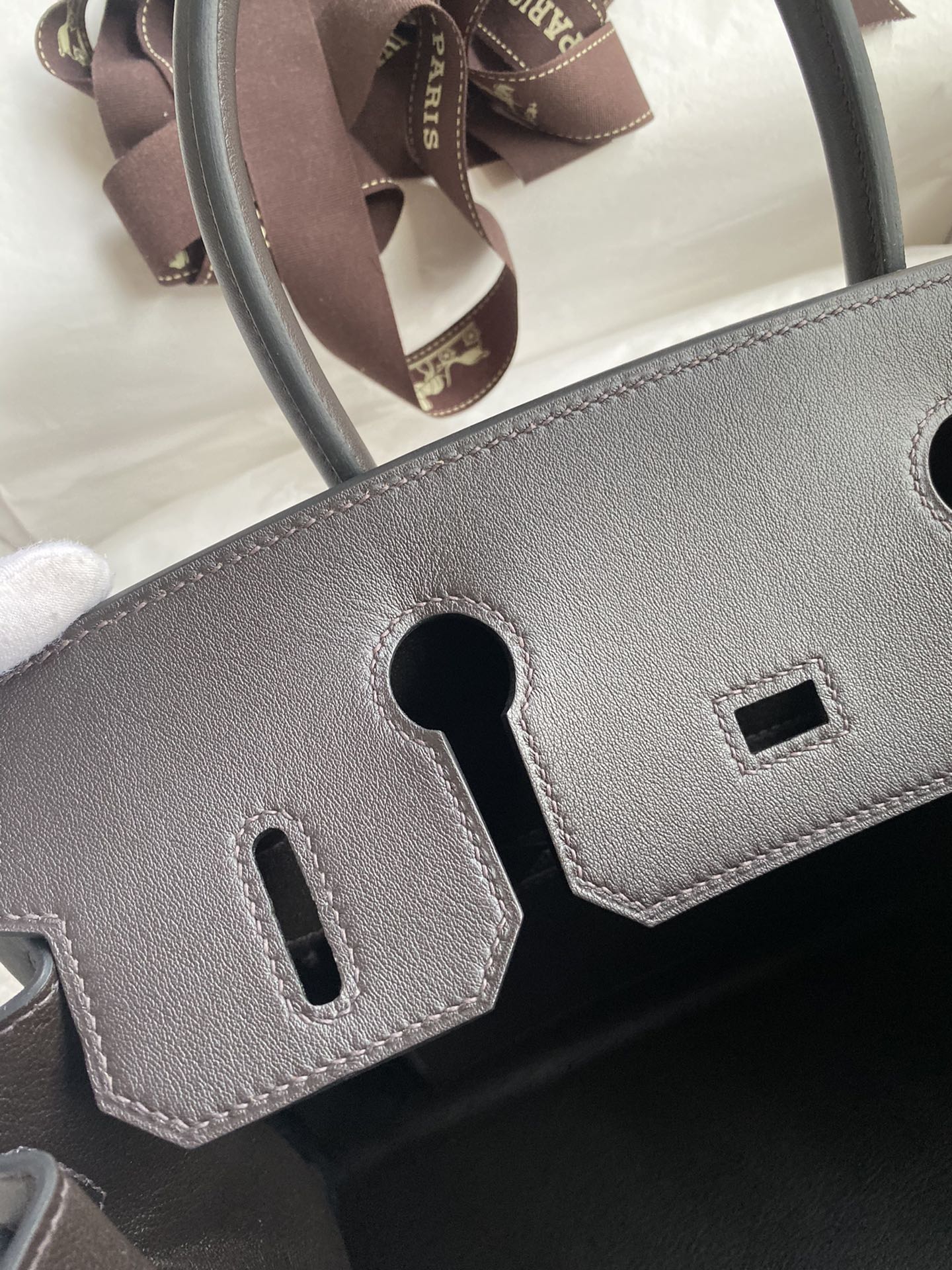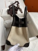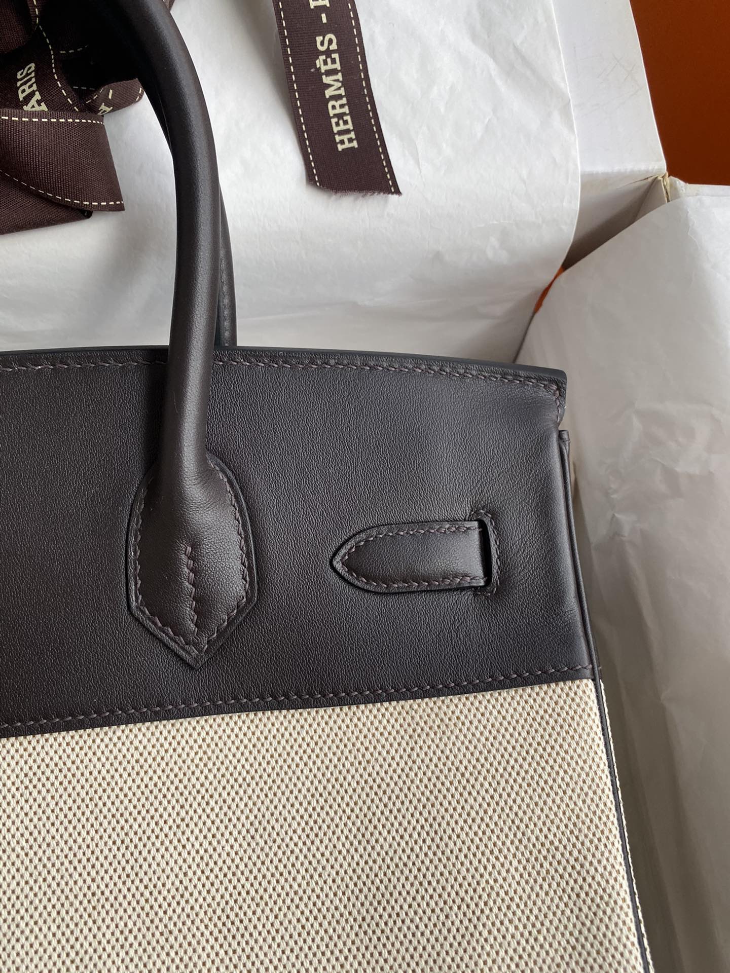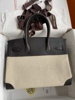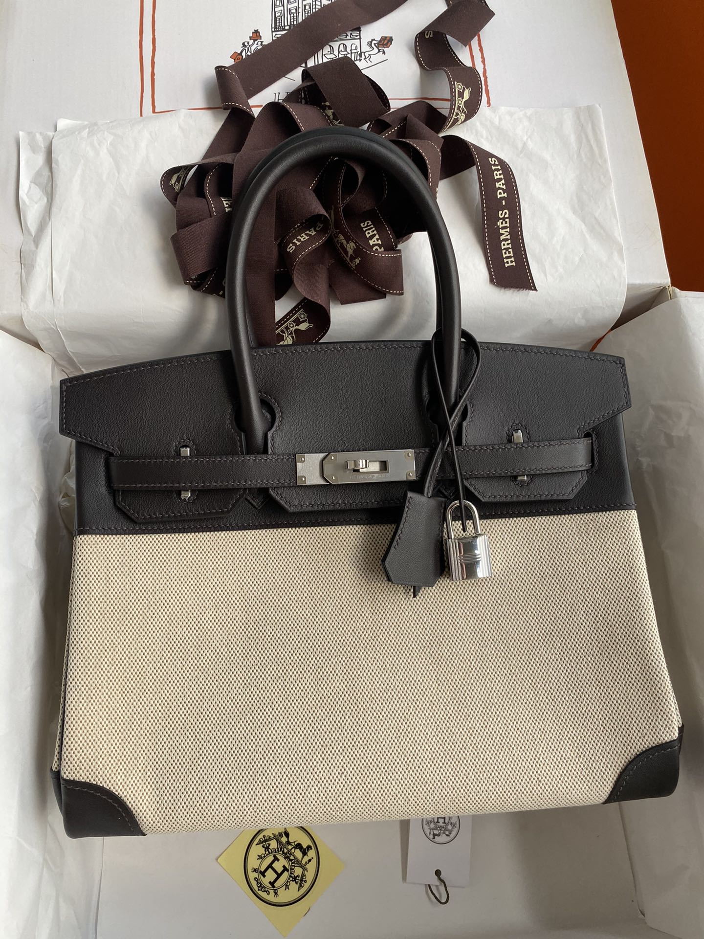 This is a replica ###Hermès Birkin 30 Ebone Swift and Beige Canvas Palladium Hardware. ###