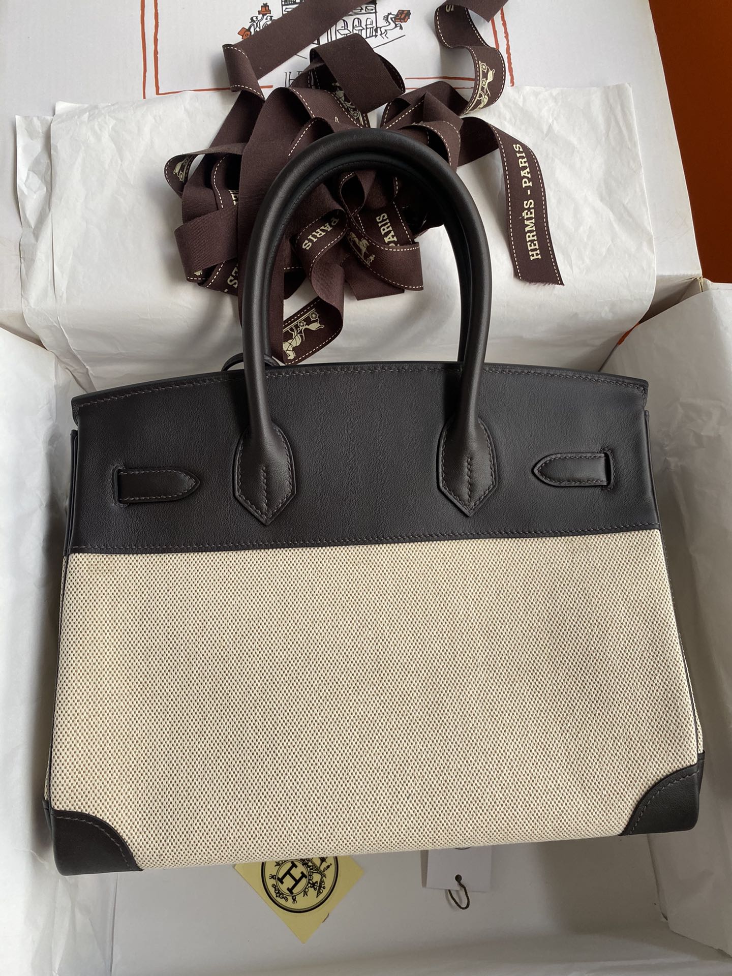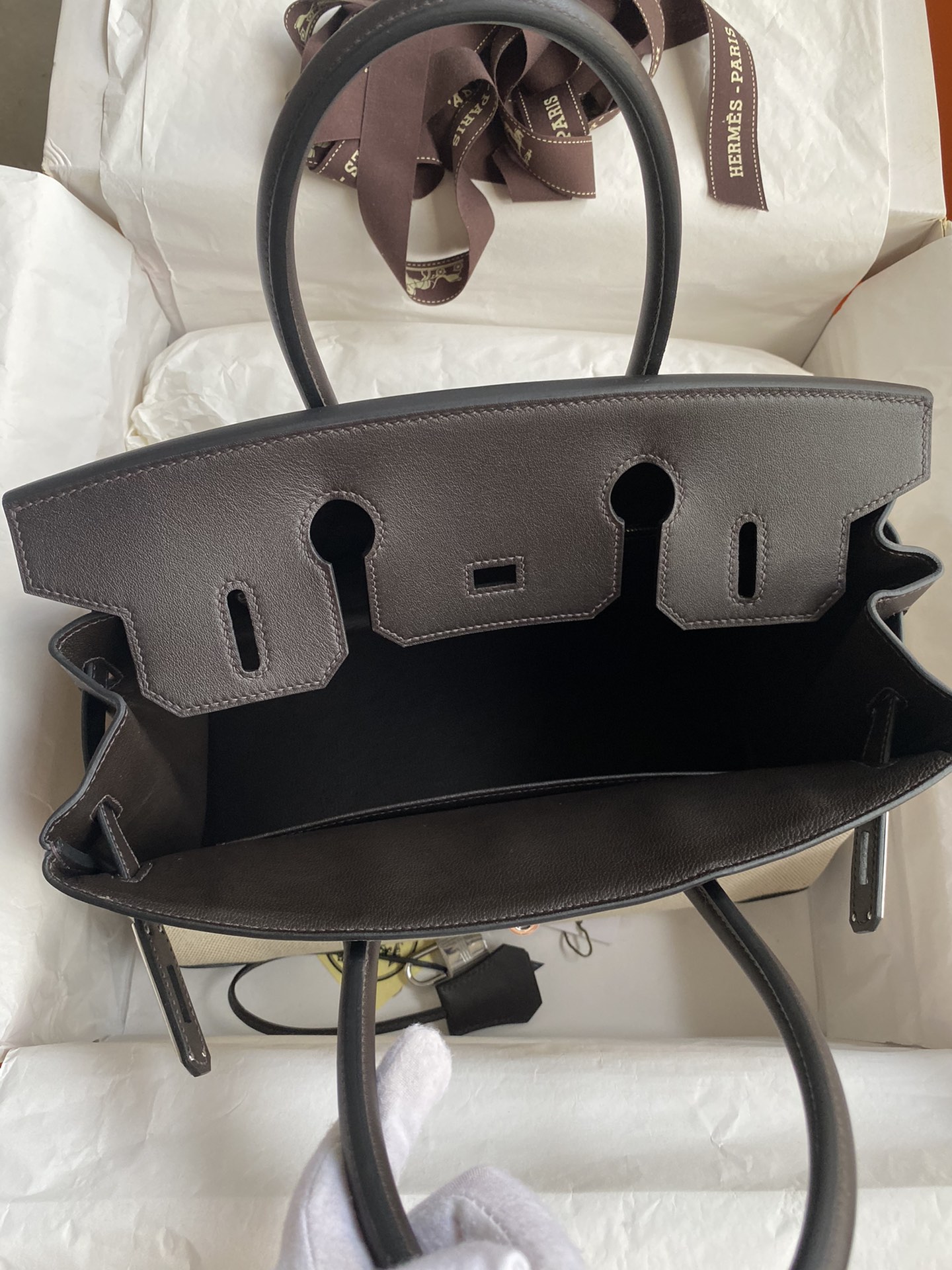 Hermès Birkin 30 Ebone Swift and Beige Canvas Palladium Hardware
