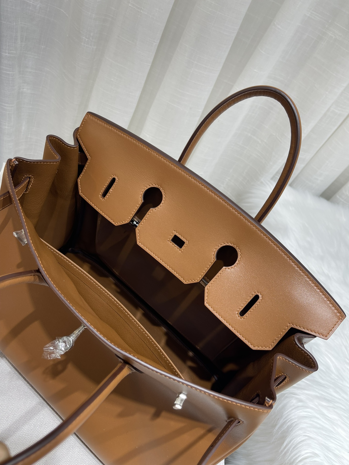###The interior is lined with Black chevre and has one zip pocket with an Hermès engraved zipper pull and an open pocket on the opposite side.###