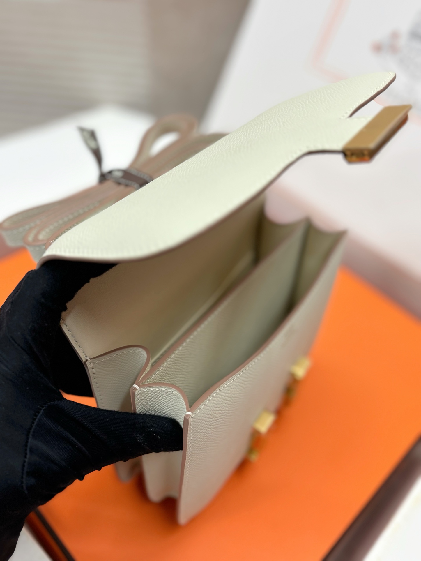 ###This Constance 18 is in Craie epsom leather with gold hardware and has tonal stitching, a metal “H” snap lock closure and adjustable shoulder strap.###