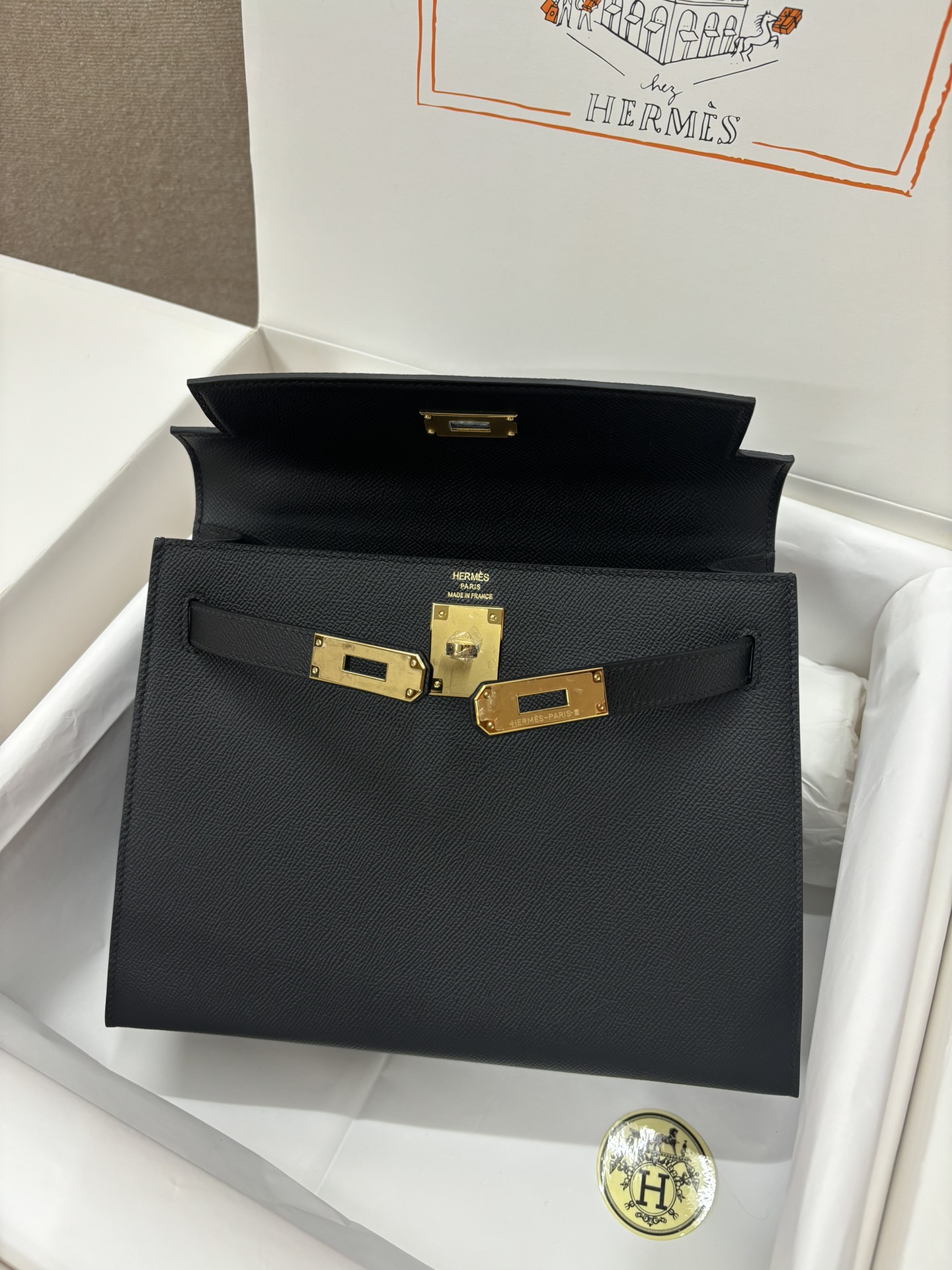 This is a replica ###Hermès Kelly Sellier 25 Black Epsom Gold Hardware. ###