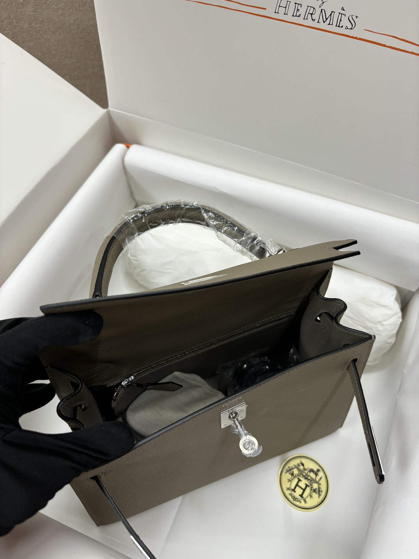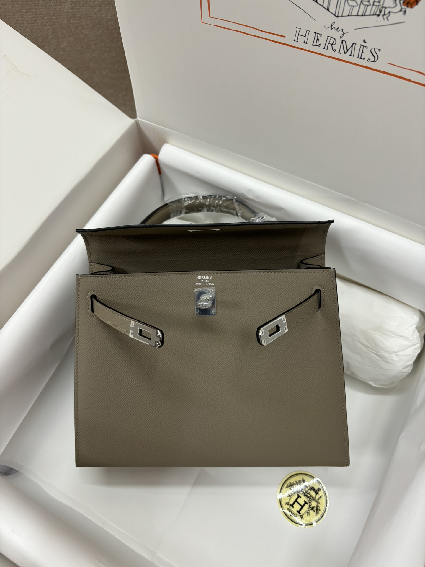 ###This Kelly, in the Sellier style, is in Etoupe epsom leather with palladium hardware and has tonal stitching, front flap, two straps with center toggle closure, clochette with lock and two keys a single rolled handle and removable shoulder strap.###