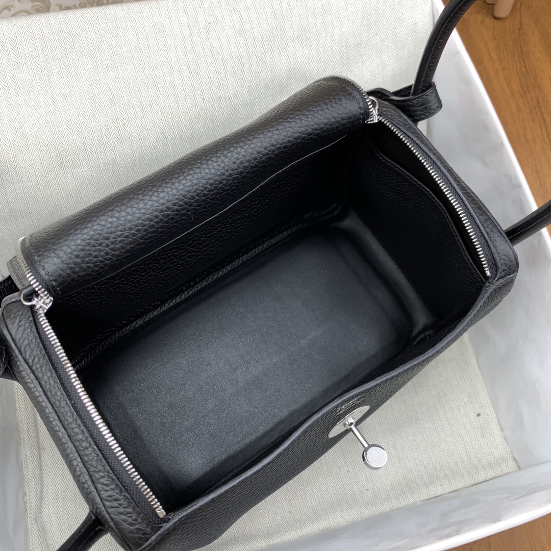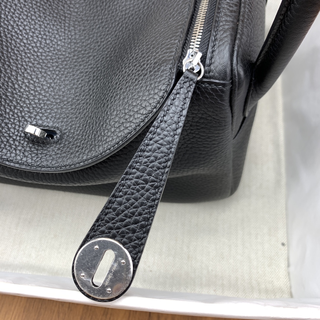 ###This Lindy is of Noir clemence with palladium hardware and features contrast stitching, double zipper pulls, center Hermès twist lock closure, five palladium feet, and two top handles that are linked by a removable shoulder strap.###