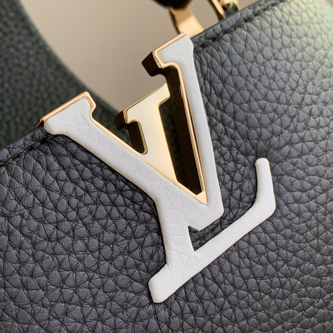 This is a replica LOUIS VUITTON M12345 Capucines BB. ,10.6 x 6.8 x 3.5 inches ,Black,Taurillon leather,Taurillon-leather trim,Cowhide-leather lining,Gold-toned hardware with enameled details,Double carry style: flap inside or outside,Compartmented interior with 1 zipped pocket and 2 flat pockets,4 protective metal base feet,Removable set of 3 chains,Strap:Removable, adjustable,Strap drop:18.3 inches,Strap drop max:21.7 inches,Handle:Single