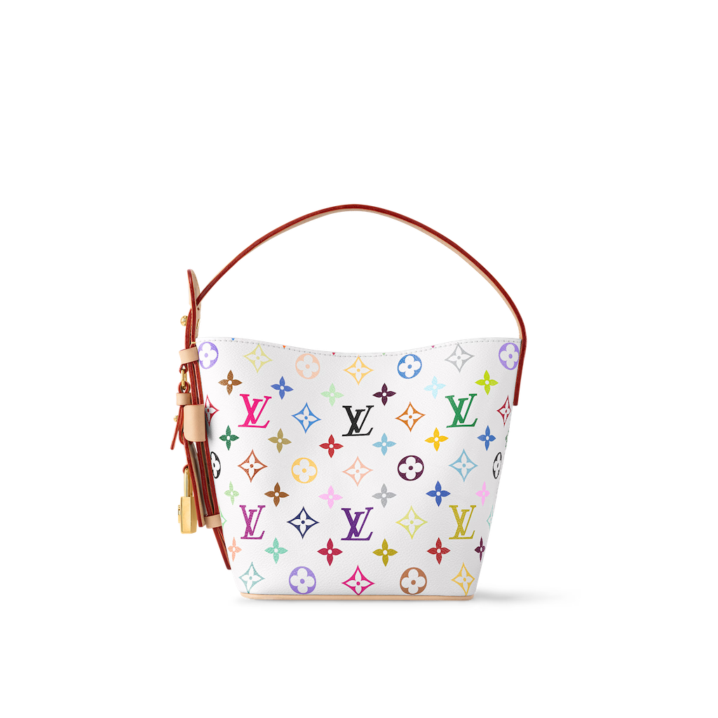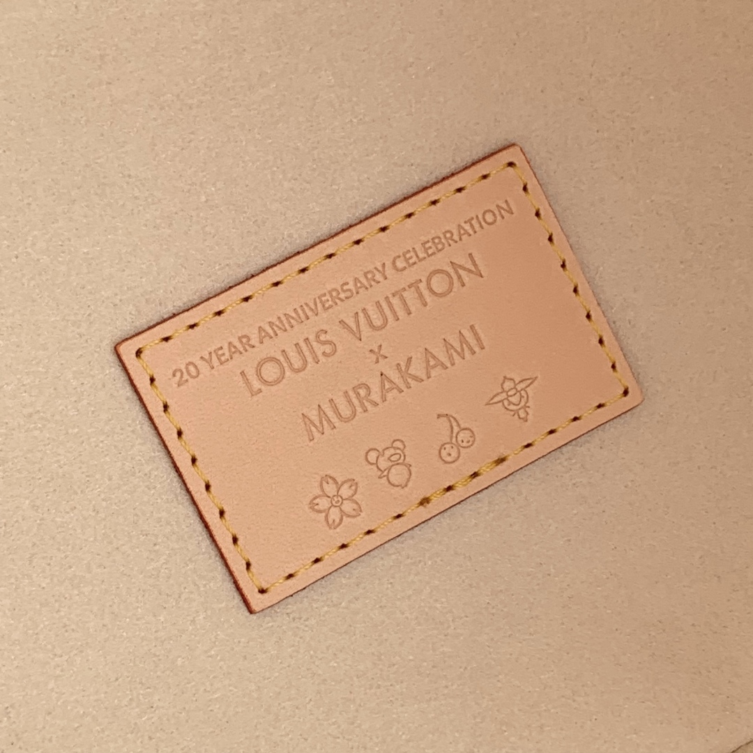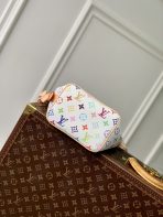 This is a replica LOUIS VUITTON M13089 ,LV x TM All In BB,Spirited signatures from the re-edition of the Louis Vuitton x Murakami collection elevate this elegant All In BB handbag with a playful twist. Crafted from coated canvas, the iconic Monogram motif is uplifted in the Japanese artist’s go-to rainbow palette, while the name tag is reimagined with a bow detail and a padlock attachment. The natural cowhide leather handle can be adjusted for hand or shoulder carry, while an additional leather strap offers a cross-body styling option.,