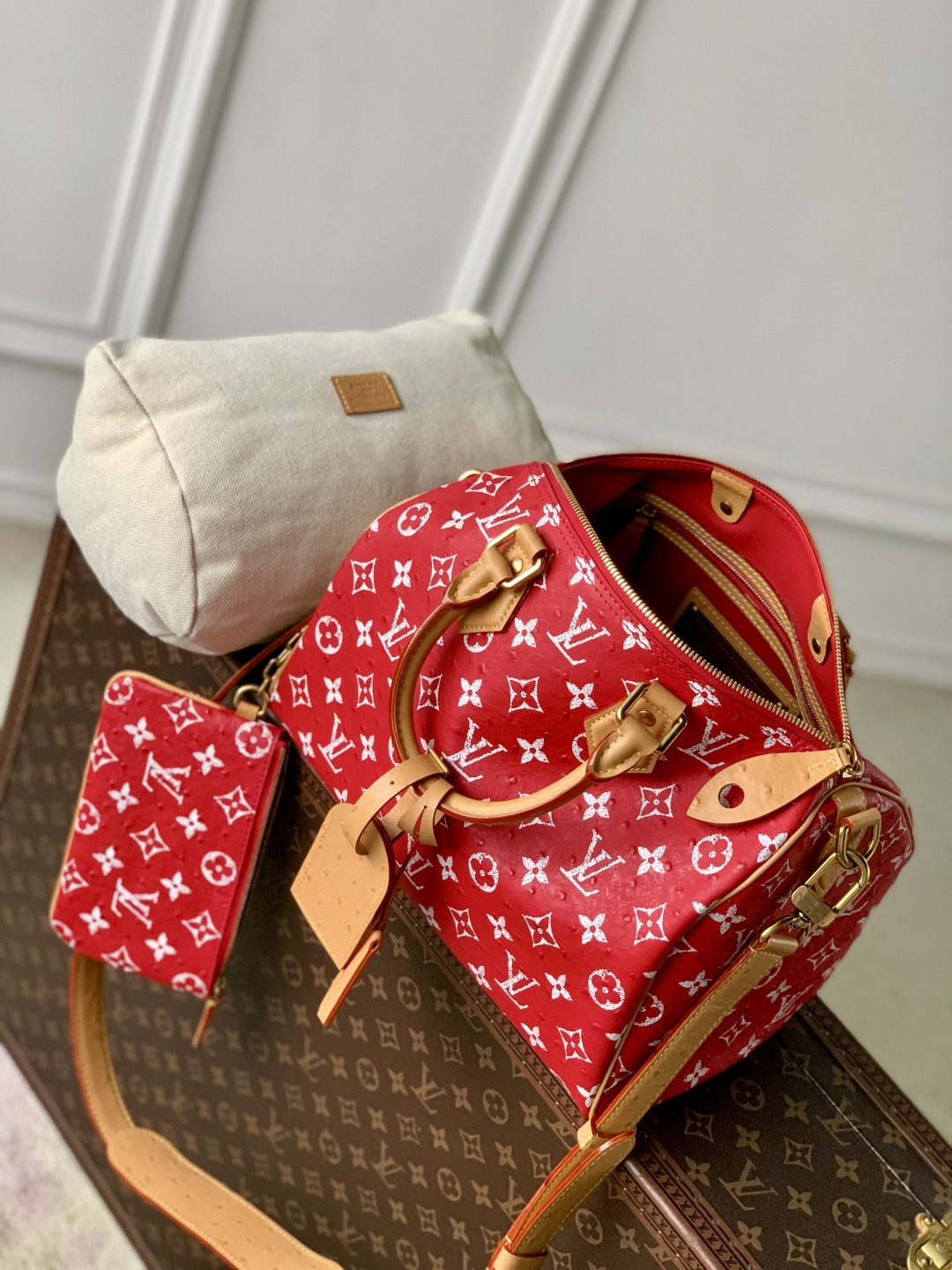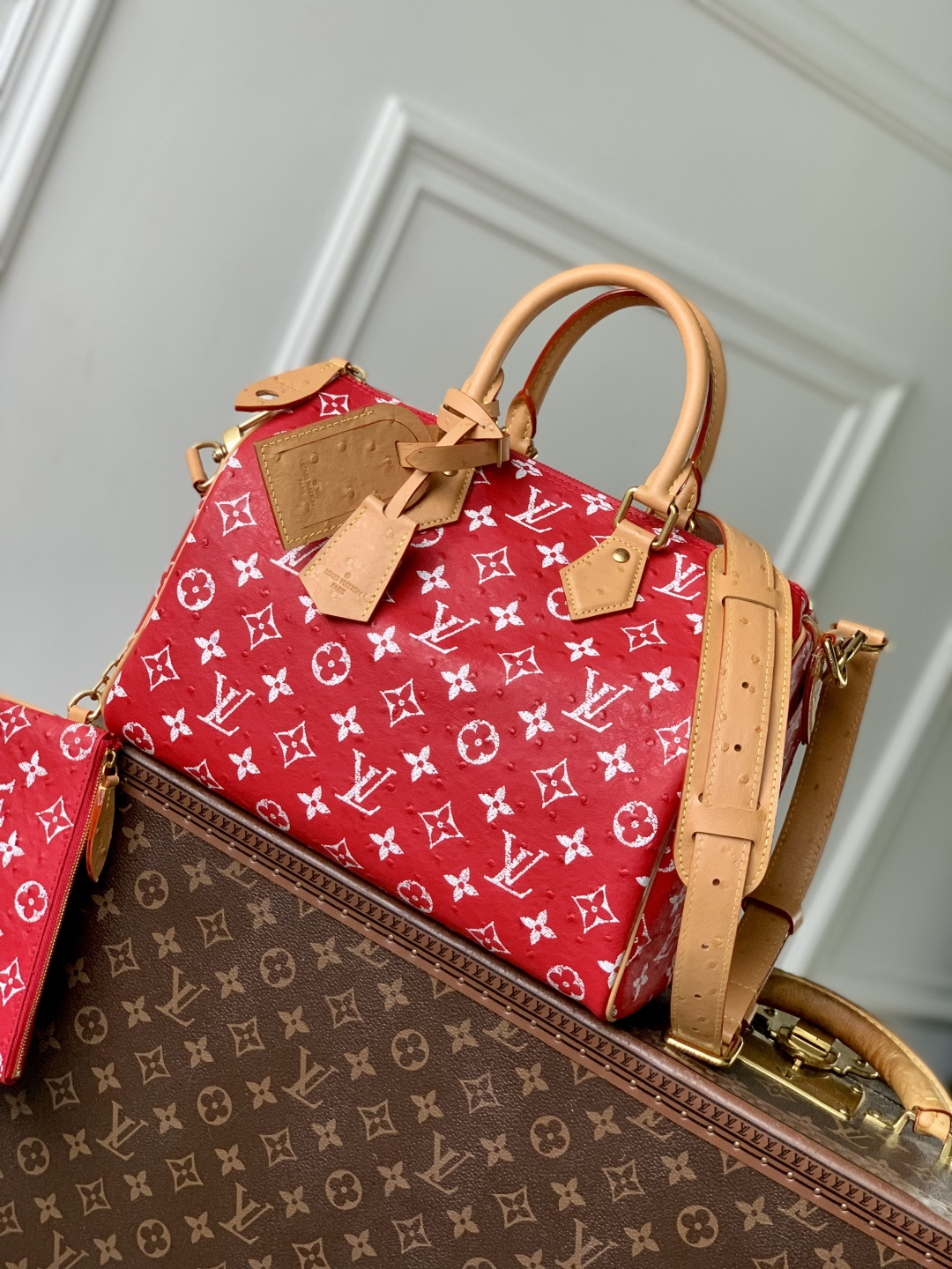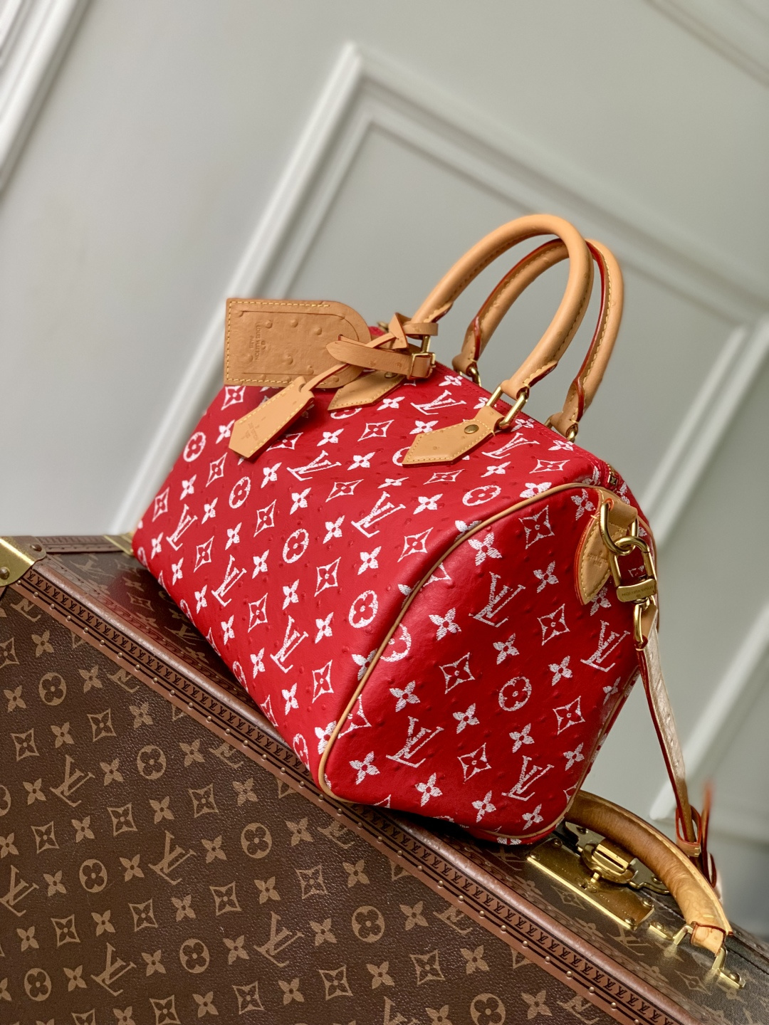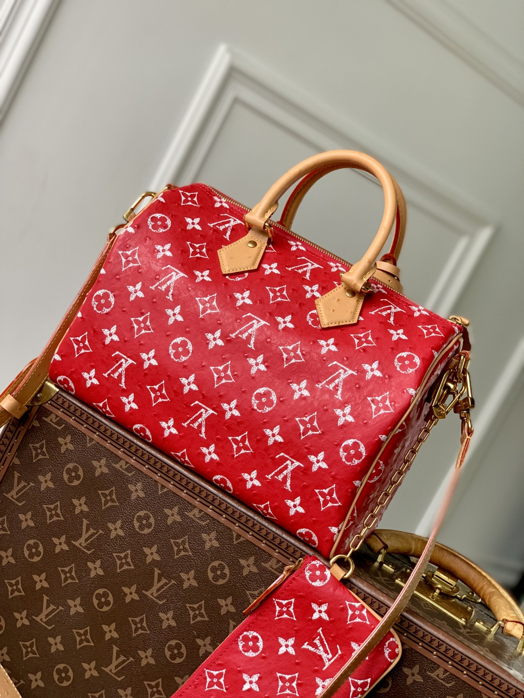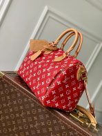 This is a replica LOUIS VUITTON M14067 Speedy P9 Bandoulière 30. ,32 x 22.5 x 18 cm ,Red,Calf leather,Calf leather trim,Lambskin lining,Aged gold-colour hardware,Main compartment with lock,Flat inside trio pocket,Zipped inside pocket,Removable pouch in leather,Name tag,Key bell,Strap: Removable, adjustable,Strap Drop: 46.0 cm,Strap Drop Max: 60.0 cm,Handle: Single x2
