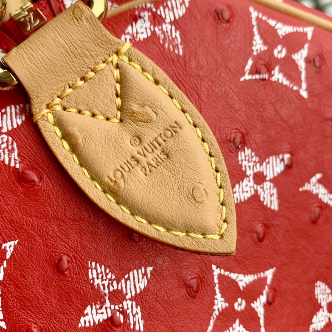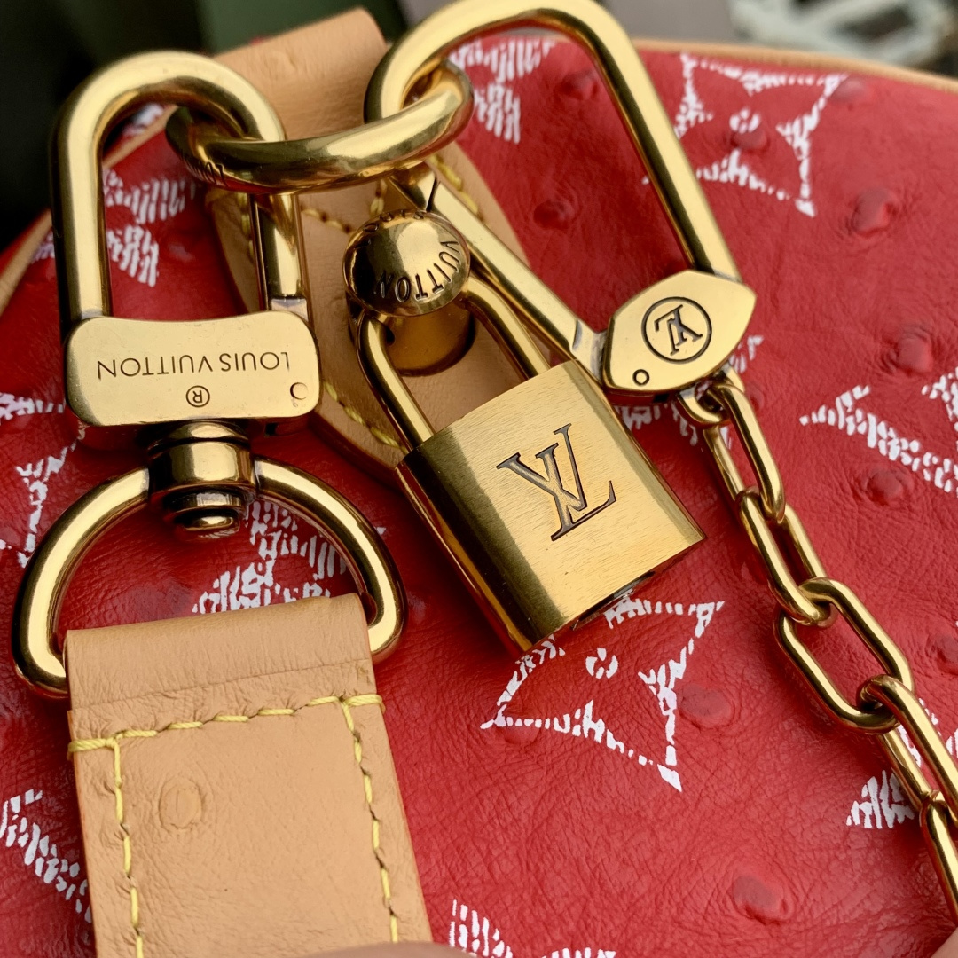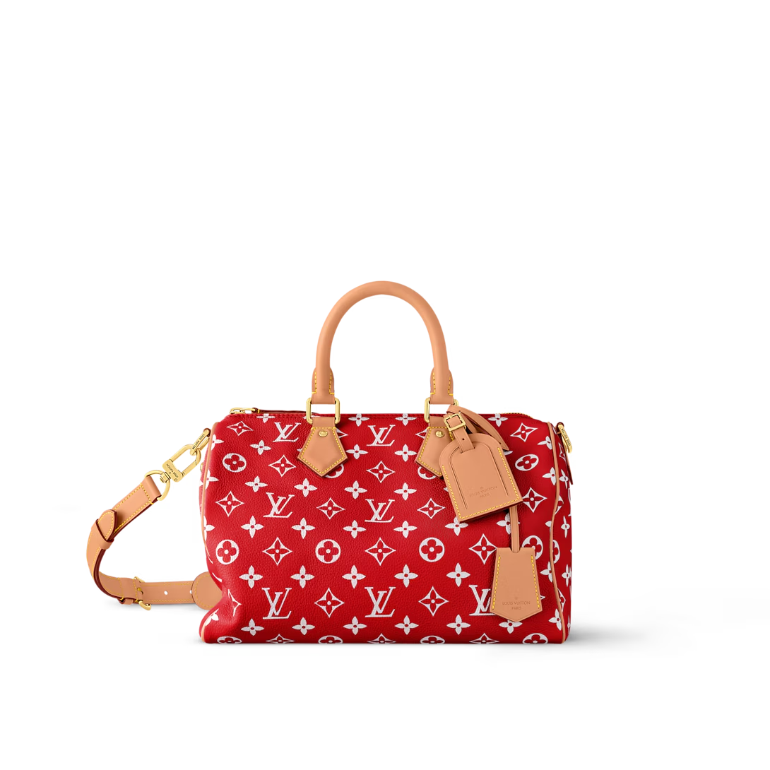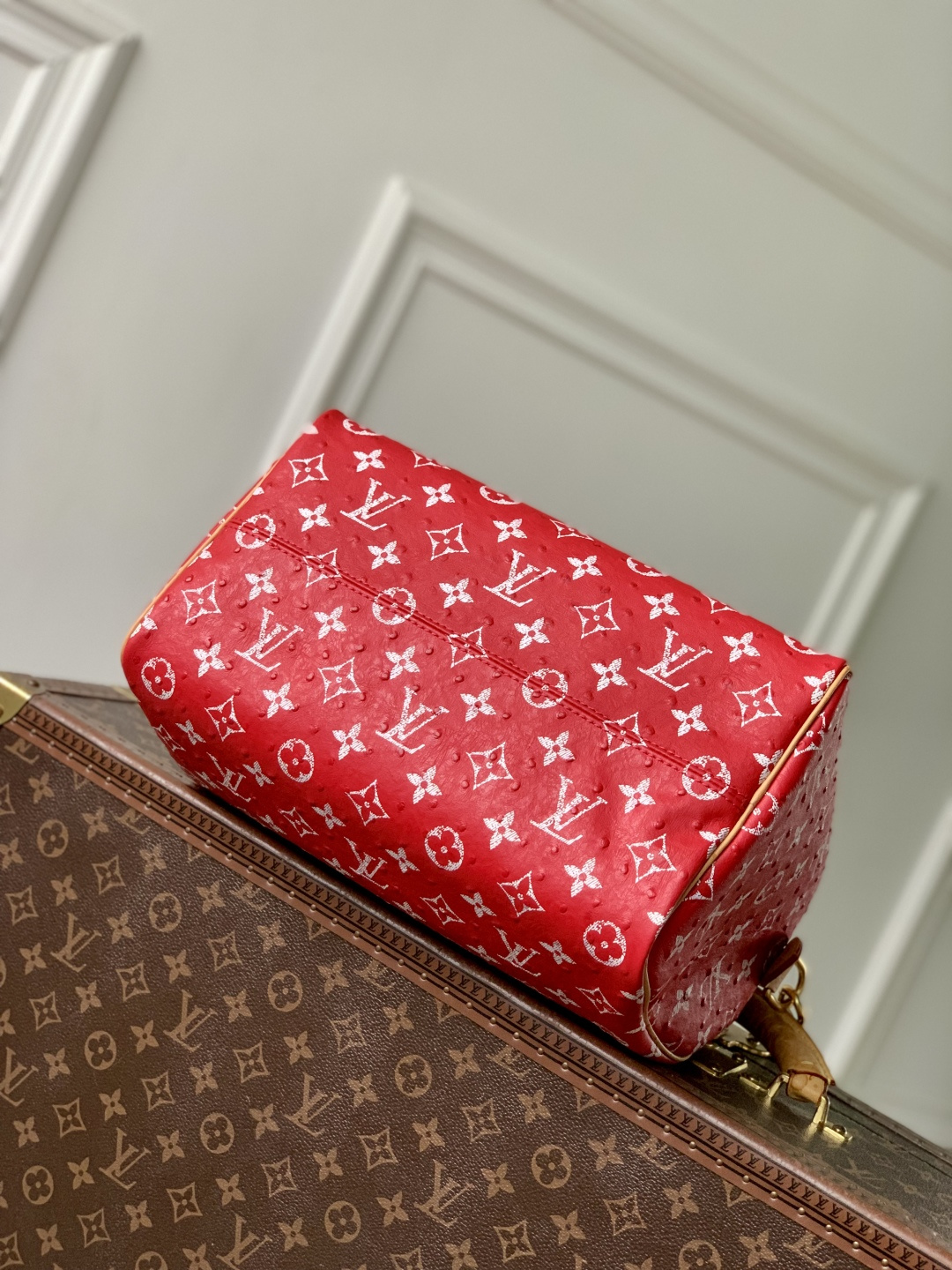 This is a replica LOUIS VUITTON M14067 Speedy P9 Bandoulière 30. ,32 x 22.5 x 18 cm ,Red,Calf leather,Calf leather trim,Lambskin lining,Aged gold-colour hardware,Main compartment with lock,Flat inside trio pocket,Zipped inside pocket,Removable pouch in leather,Name tag,Key bell,Strap: Removable, adjustable,Strap Drop: 46.0 cm,Strap Drop Max: 60.0 cm,Handle: Single x2