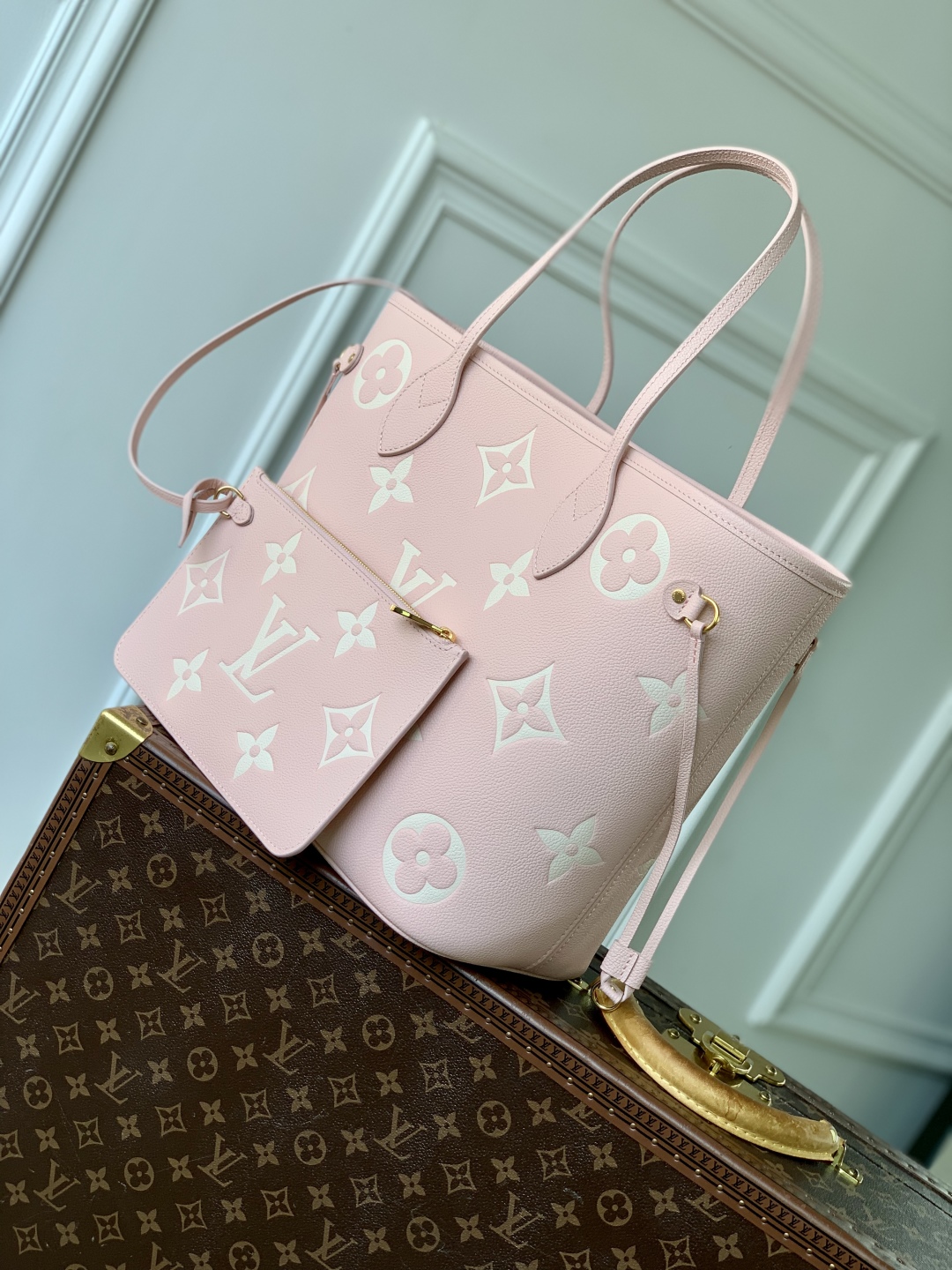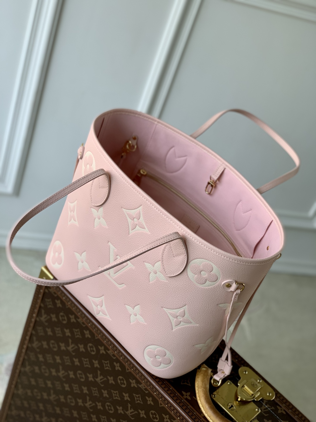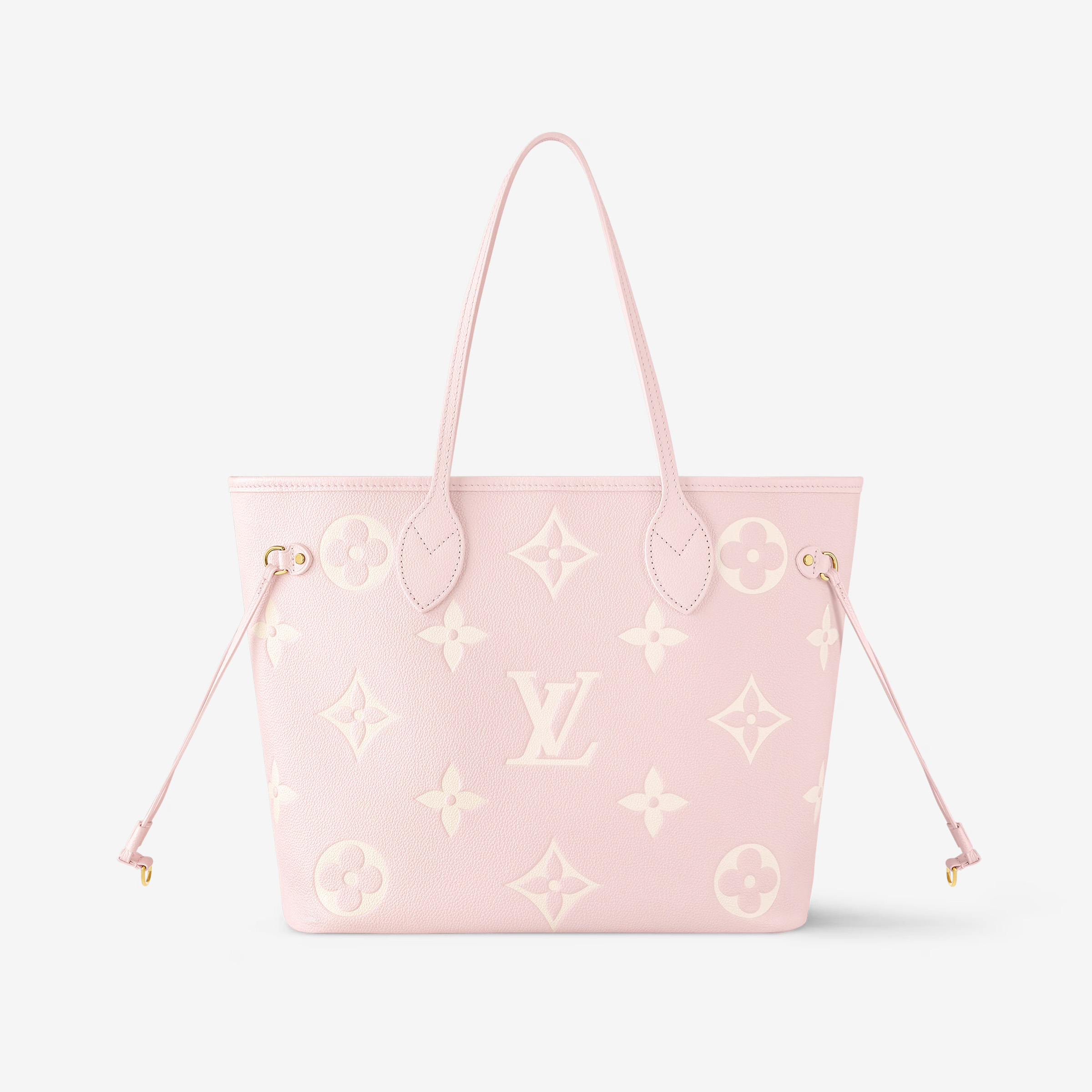 This is a replica LOUIS VUITTON M14210 Neverfull MM. ,12.2 x 11 x 5.5 inches ,Pink/Quartz Pink/Beige,Monogram Empreinte embossed cowhide leather,Grained-cowhide-leather trim,Microfiber lining,Gold-color hardware,Hook closure,Inside removable zipped pocket,4 side laces,Fits: 13-inch laptop, Smartphone, keys, Zippy wallet and earphones,Weight: 1 kg,Handle: Double