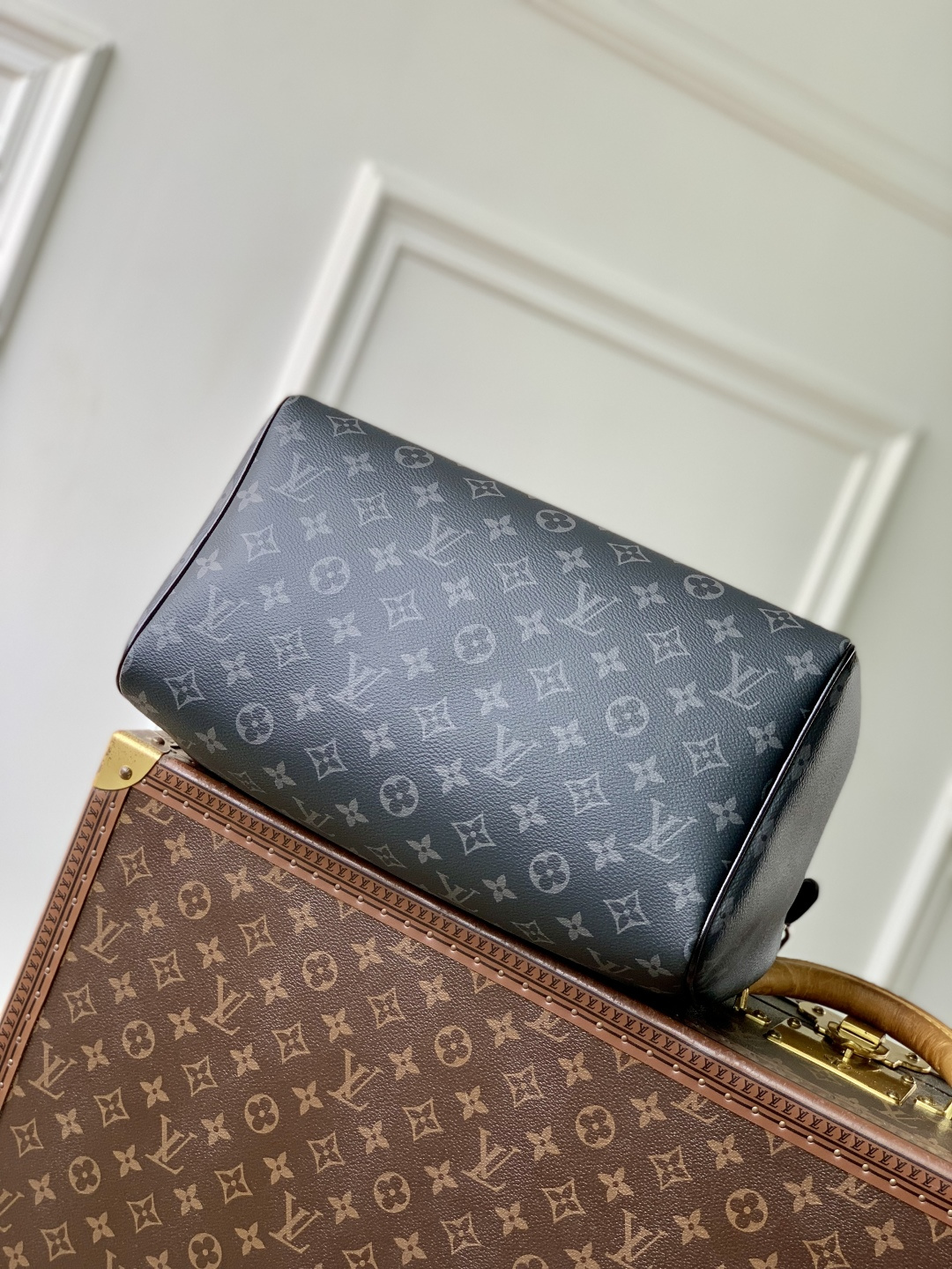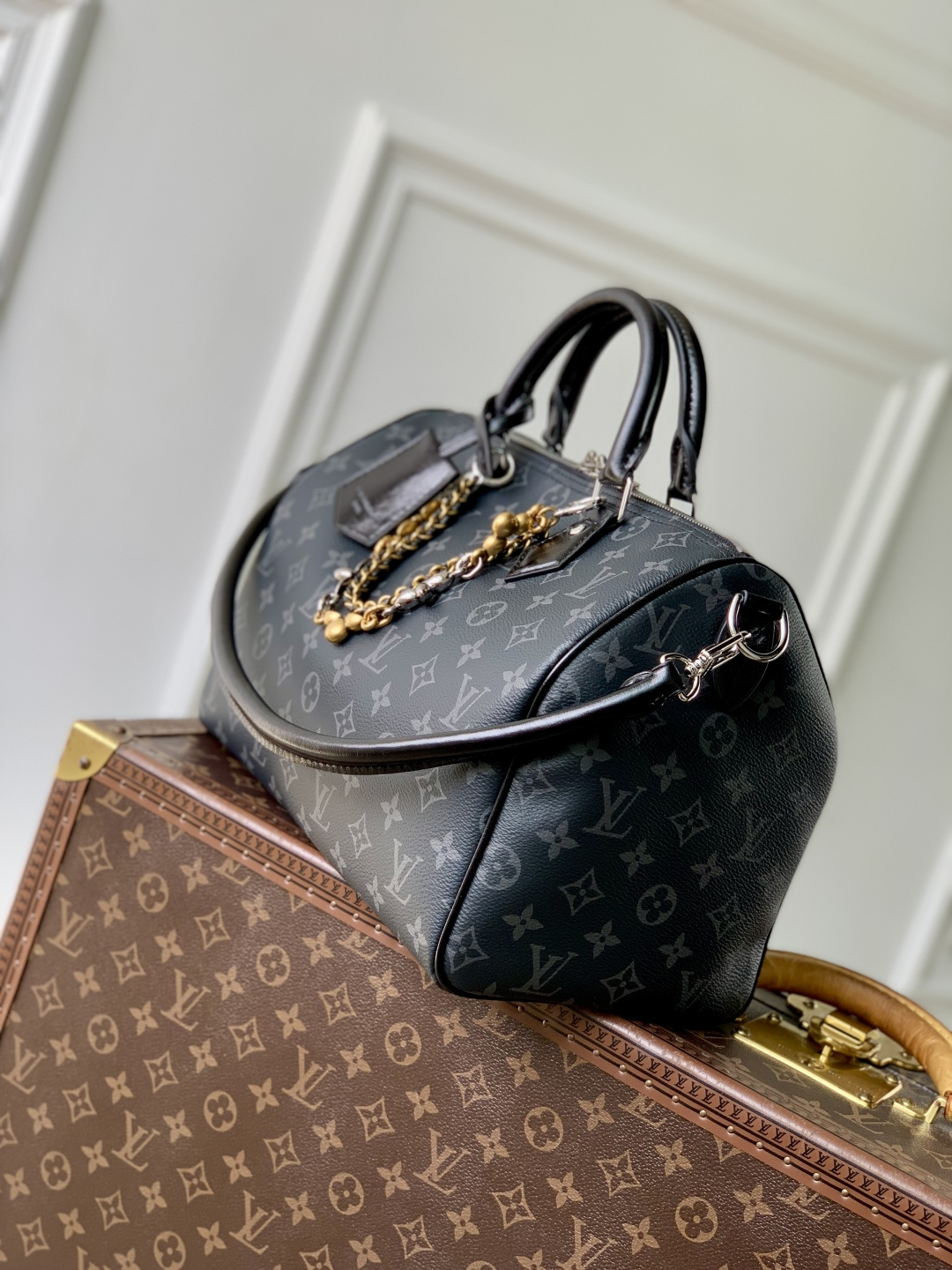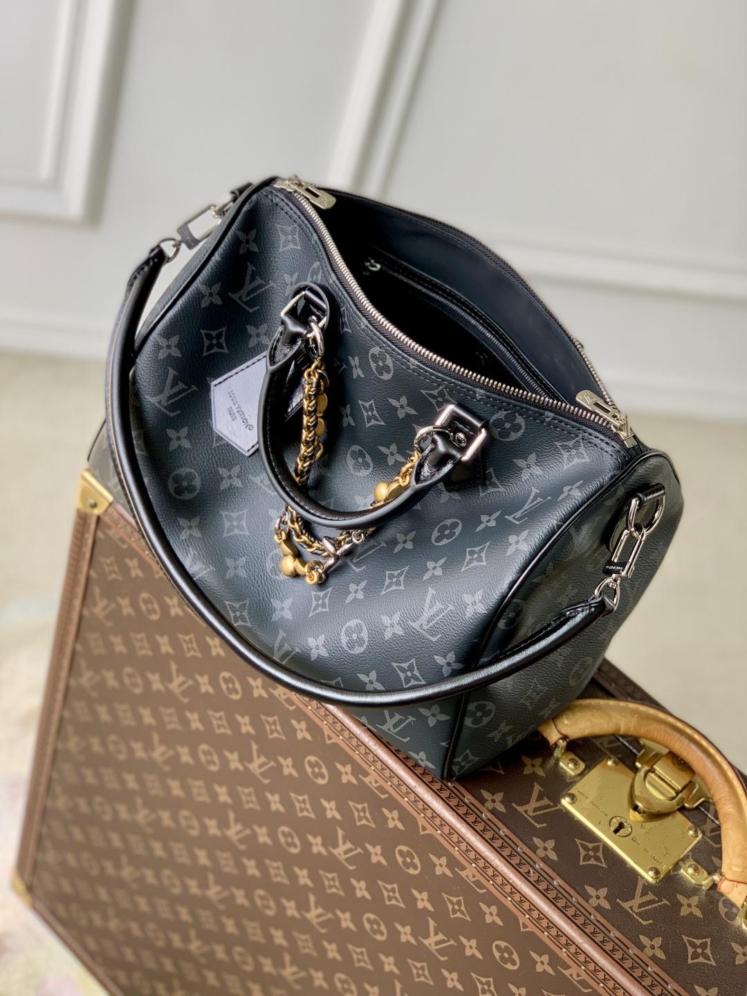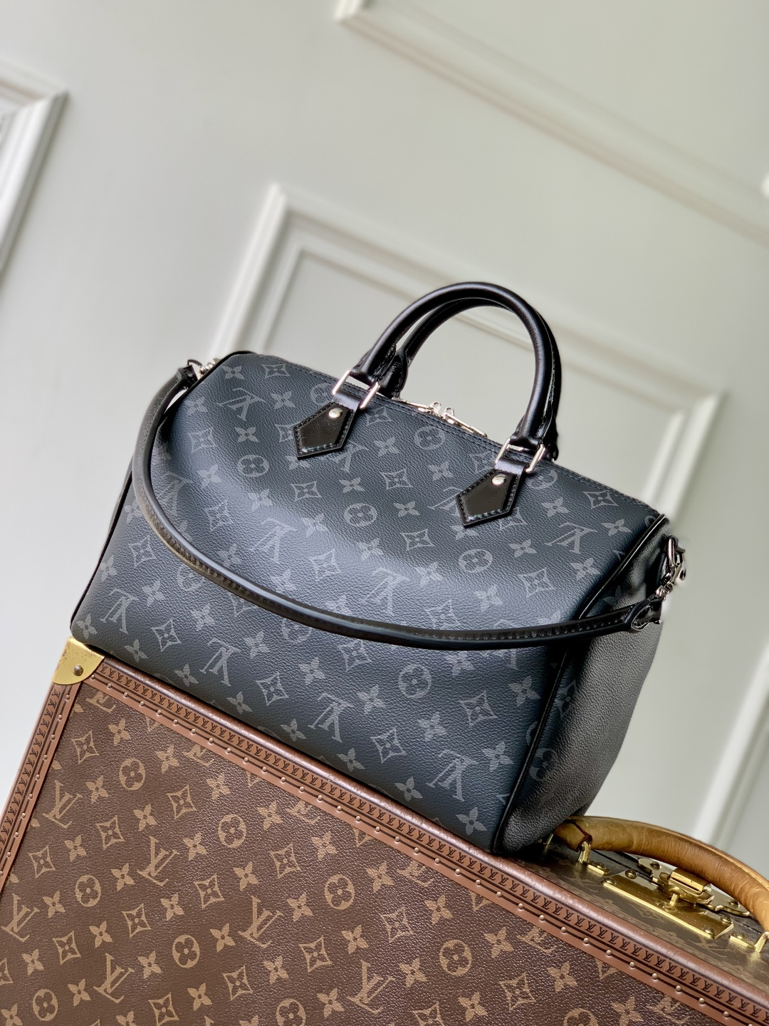 This is a replica LOUIS VUITTON M15102 Speedy Soft 30. ,11.8 x 8.3 x 6.7 inches,(Length x Height x Width),Monogram Eclipse/Black,Coated canvas,Cowhide-leather trim,Grained cowhide-leather lining,Silver-toned and gold-toned hardware,Double zipper closure,1 zipped interior pocket,1 removable double chain,1 keybell,Fits: 9-inch tablet, 6.7-inch smartphone, earphones, Zippy wallet, keys, sunglasses, lipstick,Strap:Removable, not adjustable,Strap drop:9.4 inches,Handle:Double