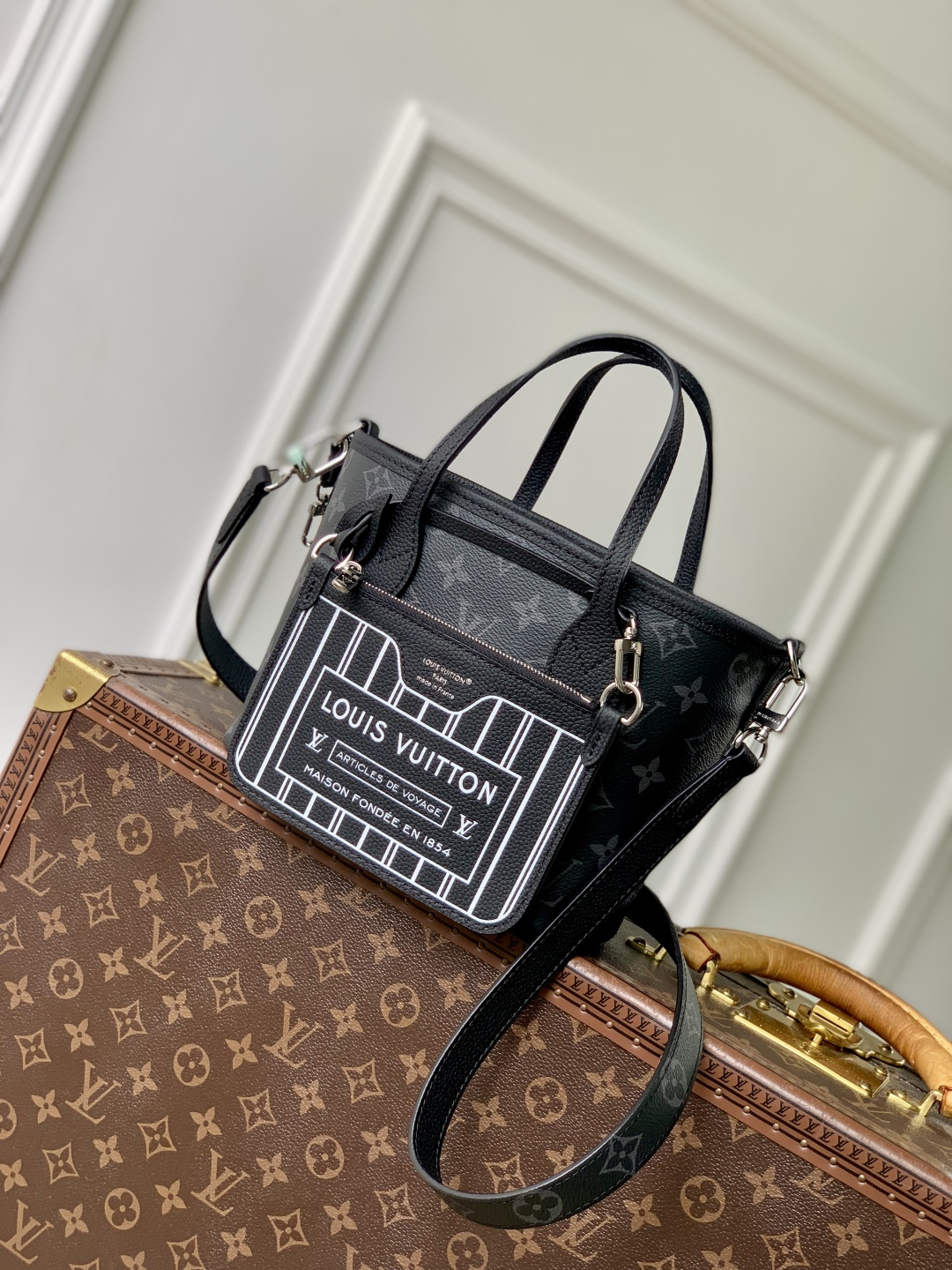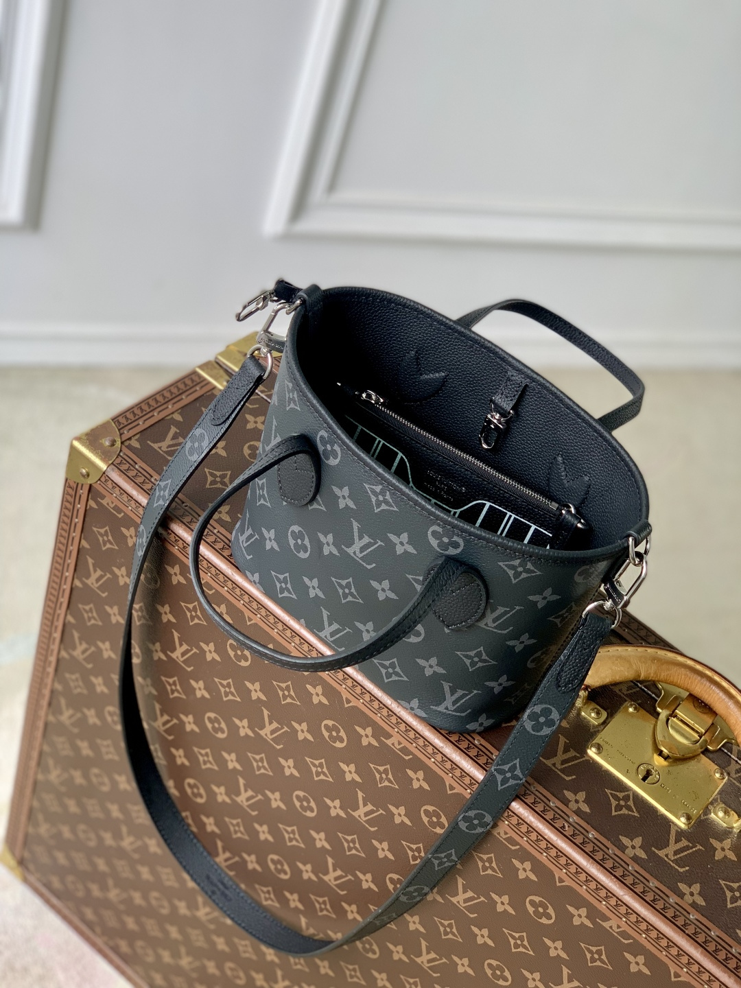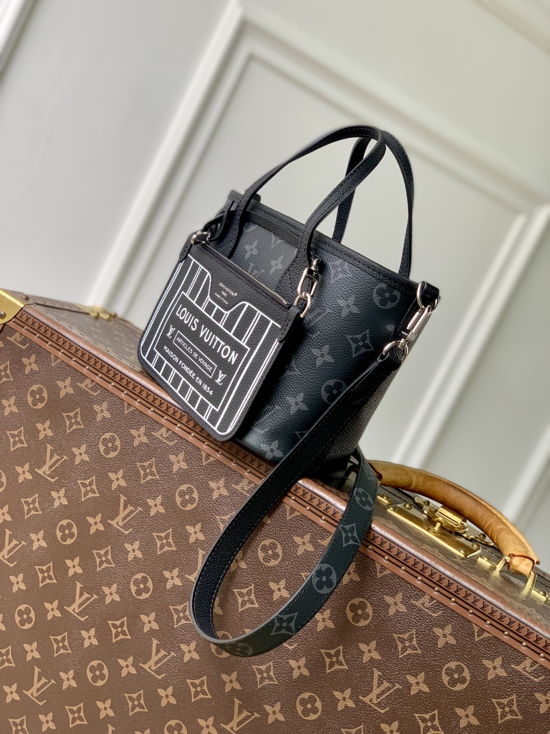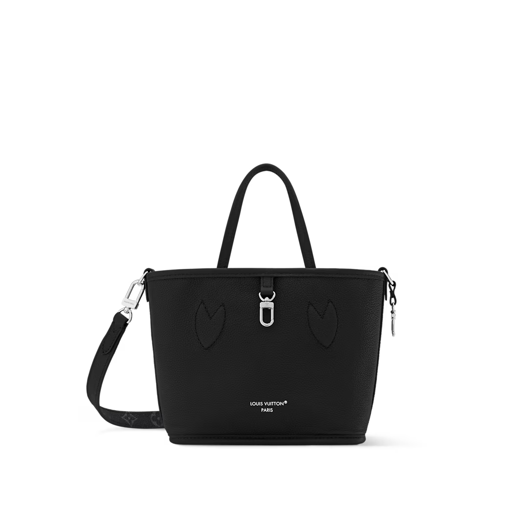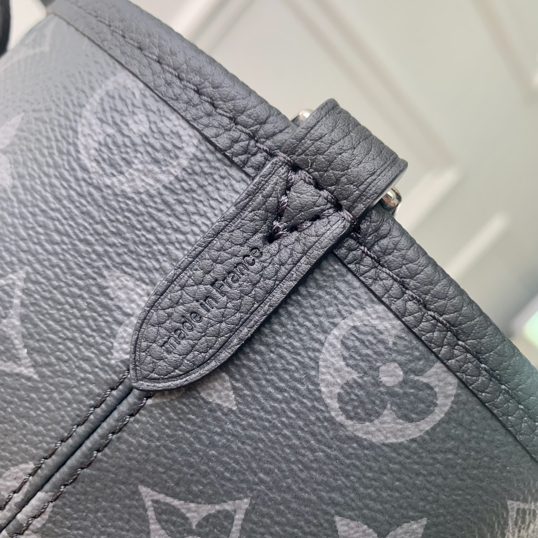 This is a replica LOUIS VUITTON M15210 Neverfull Bandoulière Inside Out BB Bag. ,26.5 x 16.5 x 11 cm ,Monogram Eclipse/Black,Coated canvas,Cowhide leather trim,Grained cowhide leather lining,Silver-colour hardware,1 hook closure,Removable zipped pouch,Fits 6.7-inch smartphone, earphones, Rosalie coin purse, keys, lipstick,Strap: Removable, non-adjustable,Strap Drop: 50.0 cm,Handle: Single x2