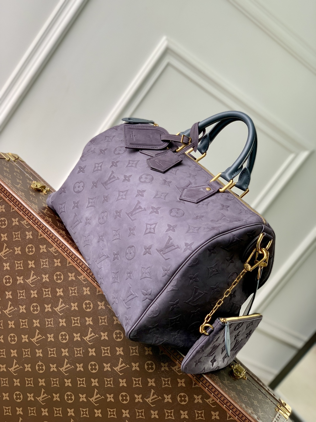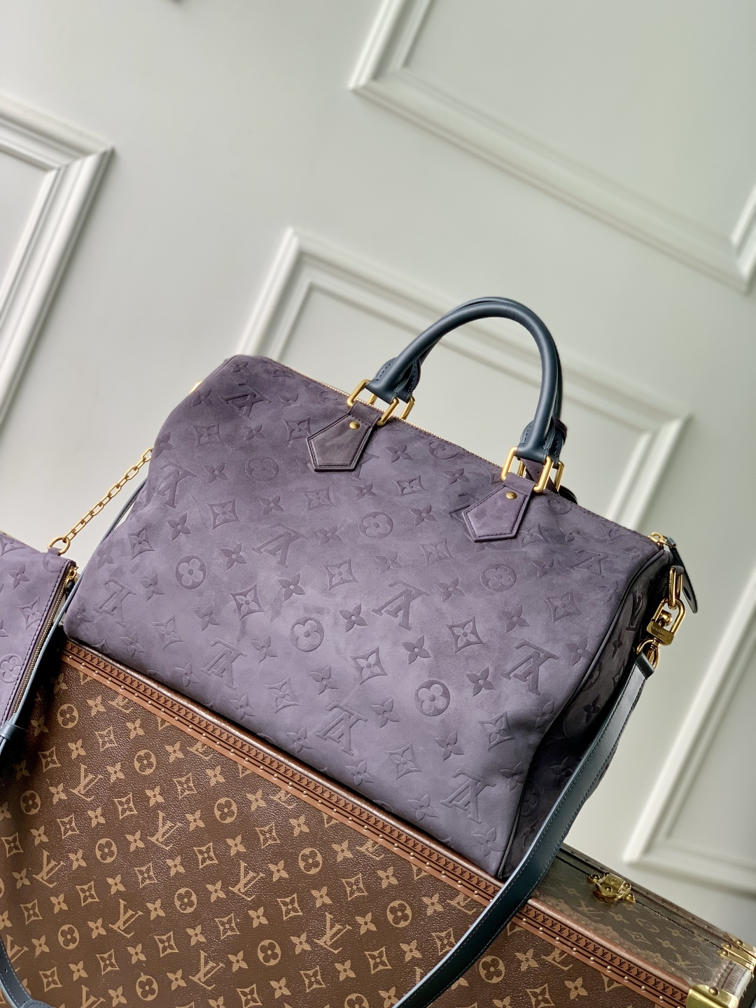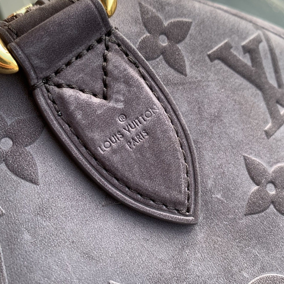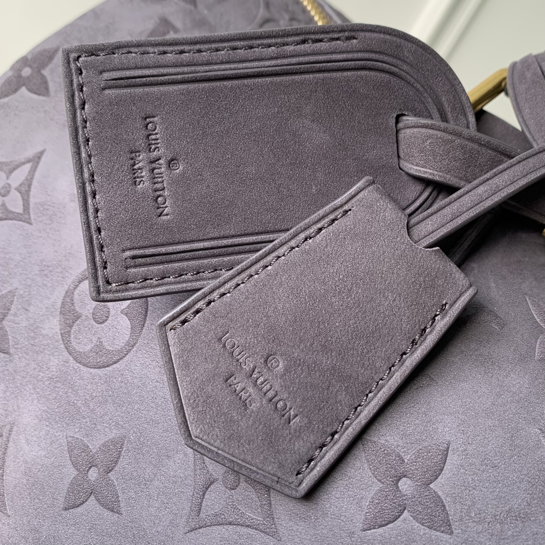 This is a replica LOUIS VUITTON M15225 Speedy P9 Bandoulière 40. ,40 x 26 x 23 cm ,Grey,Suede,Cowhide leather trim,Lambskin leather lining,Coloured hardware,Main compartment with lock,Flat inside trio pocket,Zipped inside pocket,Removable pouch in leather,Name tag,Key bell,Strap: Removable, adjustable,Strap Drop: 46.0 cm,Strap Drop Max: 60.0 cm,Handle: Single x2