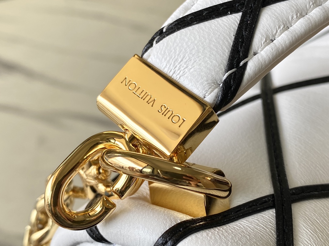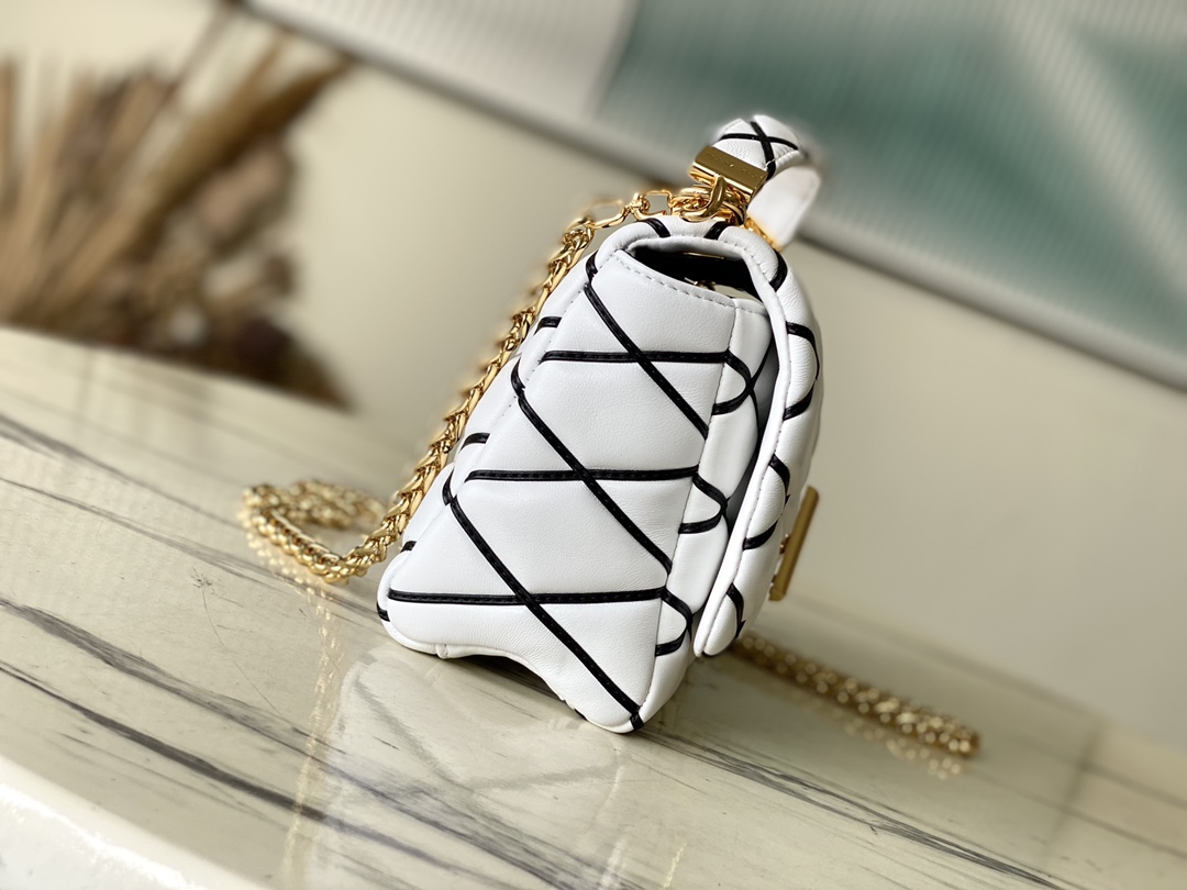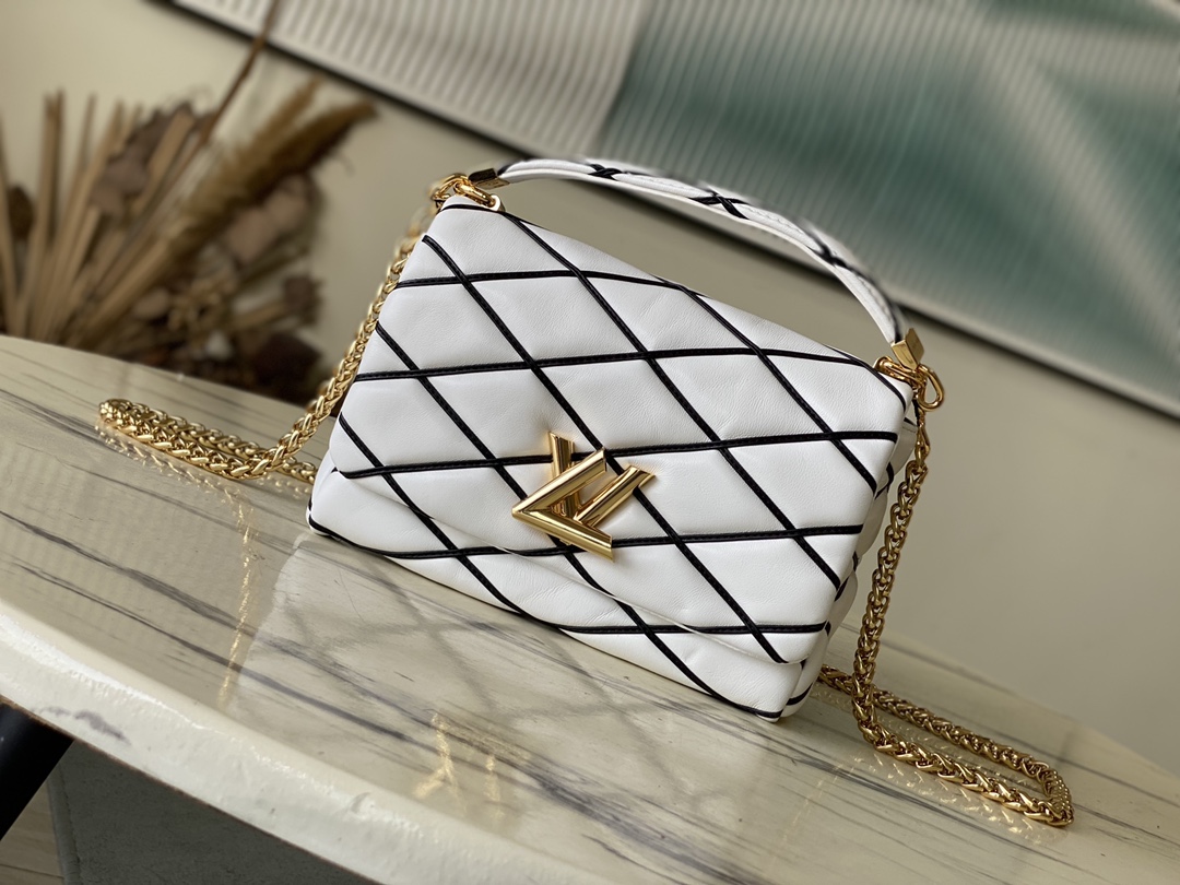 This is a replica LOUIS VUITTON M22890 GO-14 MM. ,9.1 x 6.3 x 3.9 inches ,White/Black,Lambskin,Lambskin trim,Cowhide-leather lining,Gold-color hardware,Flap with LV Twist lock,Inside back zipped pocket,Inside back flat pocket with mirror,Fits: 6.7-inches smartphone, Rosalie Coin Purse, earphones, lipstick, tissues, keys, sunglasses,Chain:Sliding, removable,Handle:Single