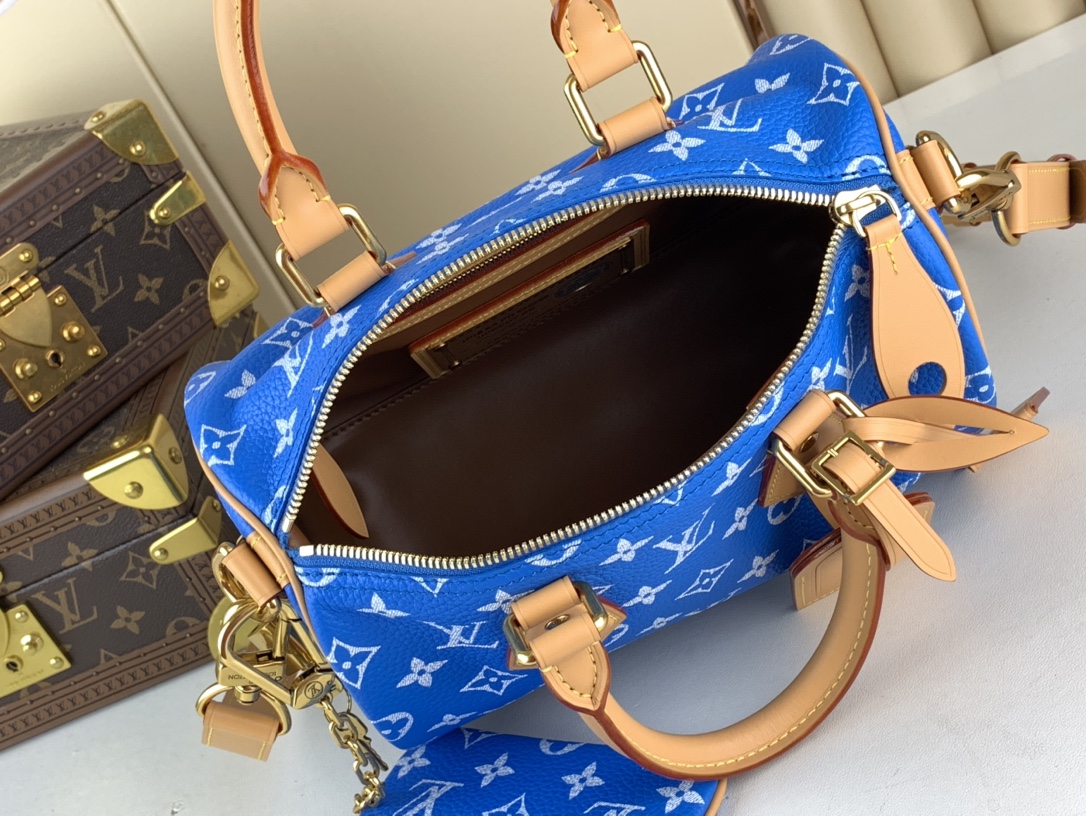 This is a replica LOUIS VUITTON M24424 Speedy P9 Bandoulière 25. ,9.8 x 7.5 x 5.9 inches ,Blue,Soft calfskin,Natural cowhide-leather trim,Lambskin lining,Gold-color hardware,Main compartment with lock,Inside zipped pocket,Removable pouch in leather,Name tag,Key bell,Strap:Removable, adjustable,Strap drop:21.7 inches,Strap drop max:24.8 inches,Handle:Double