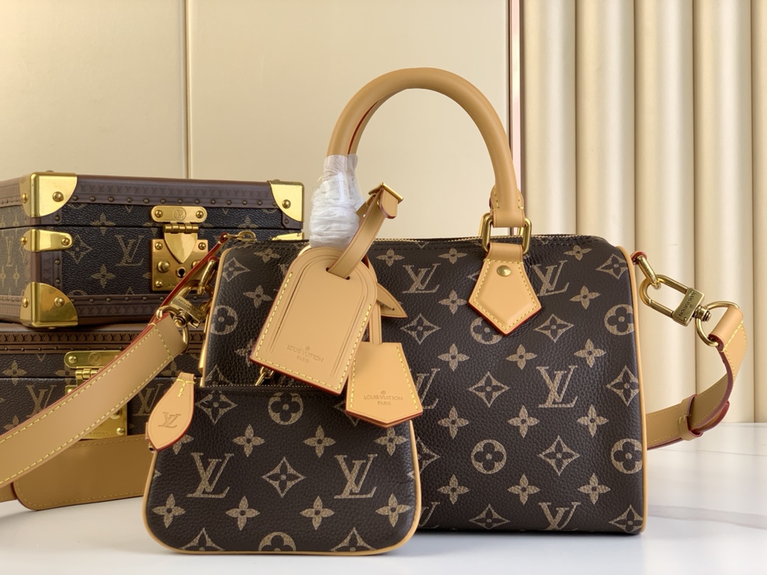 This is a replica LOUIS VUITTON M24443 Speedy P9 Bandoulière 25. ,9.8 x 7.5 x 5.9 inches ,Monogram,Soft calfskin,Natural cowhide-leather trim,Lambskin lining,Gold-color hardware,Main compartment with lock,Inside zipped pocket,Removable pouch in leather,Name tag,Key bell,Strap:Removable, adjustable,Strap drop:21.7 inches,Strap drop max:24.8 inches,Handle:Double