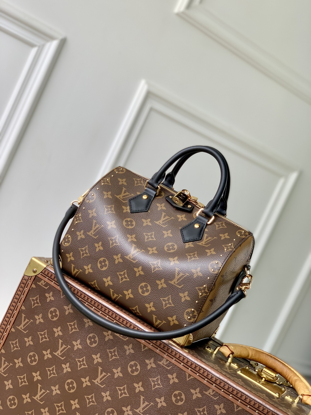 This is a replica LOUIS VUITTON M26181 Speedy Trunk 25. ,27 x 20 x 15 cm ,Monogram,Coated canvas,Cowhide leather trim,Microfibre lining,Gold-colour hardware,Double zip closure,Side sliding straps,Fits 6.7-inch smartphone, earphones, Sarah Wallet, sunglasses, keys, lipstick,Handle: Single x2