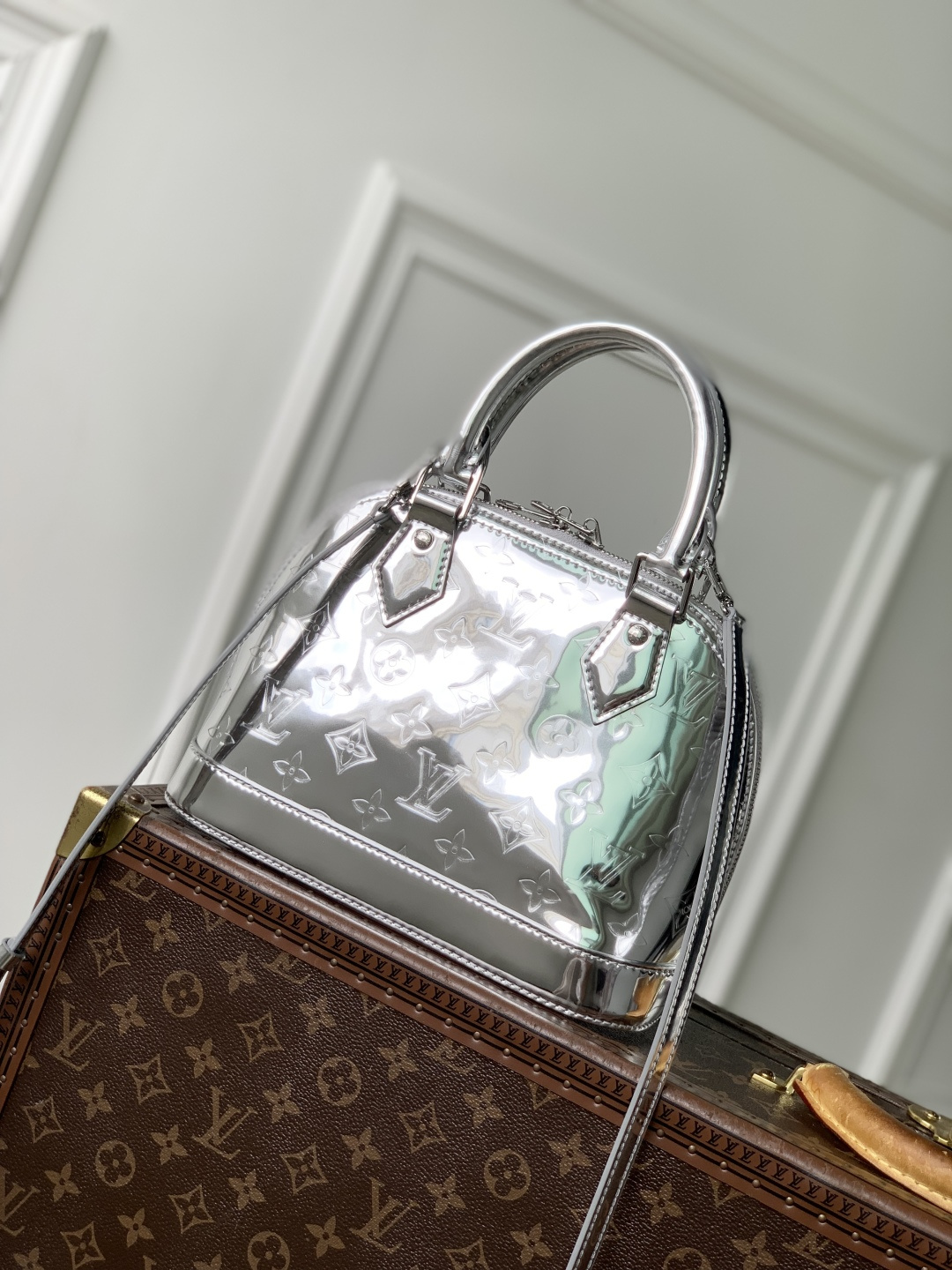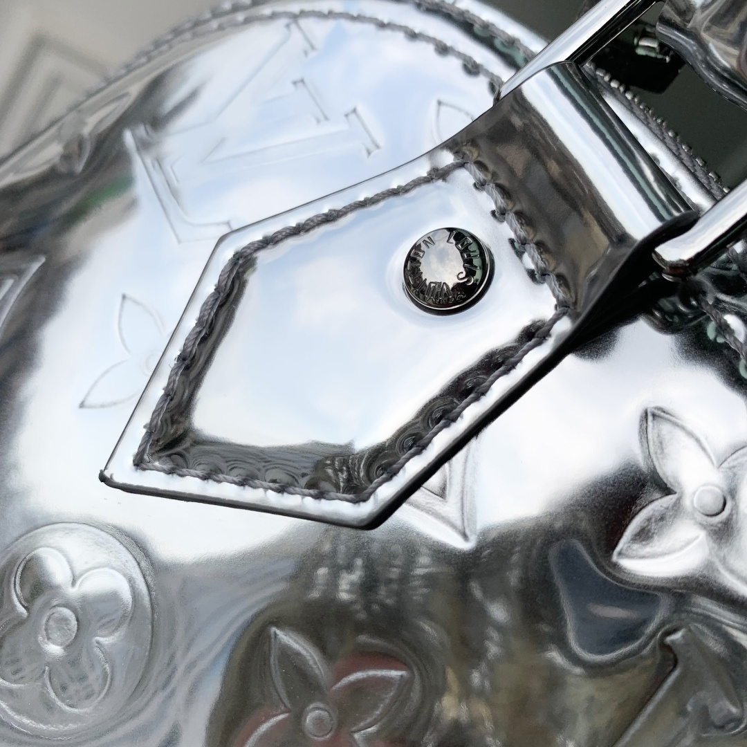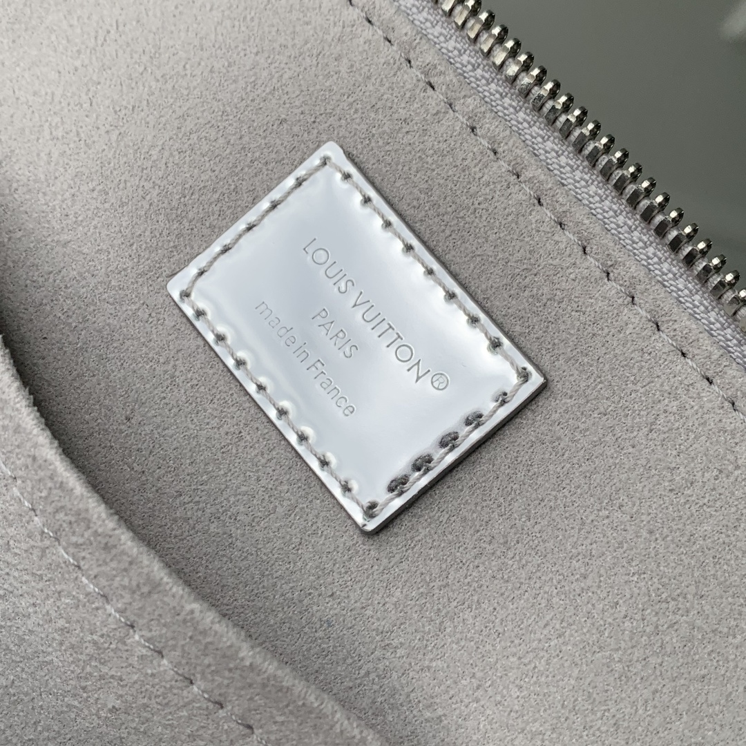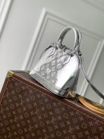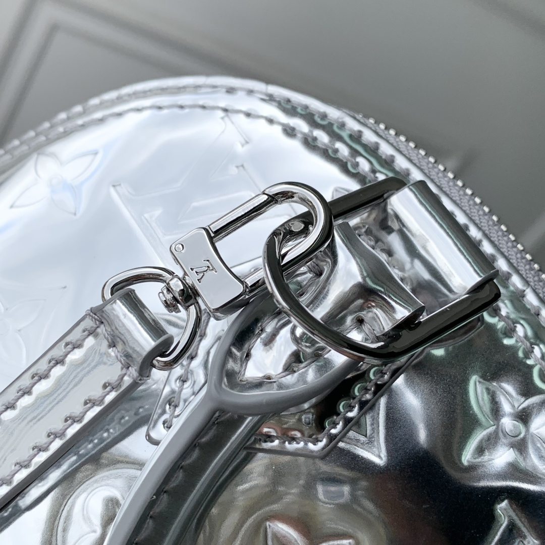 This is a replica LOUIS VUITTON M26335 Alma BB. ,23.5 x 17.5 x 11.5 cm ,Silver,Coated canvas,Coated canvas trim,Textile lining (cotton and polyester),Silver-colour hardware,Double zip closure with padlock,1 inside flat pocket,Fits 6.7-inch smartphone, earphones, sunglasses, keys, lipstick,Strap: Removable, non-adjustable,Strap Drop: 52.0 cm,Handle: Single x2