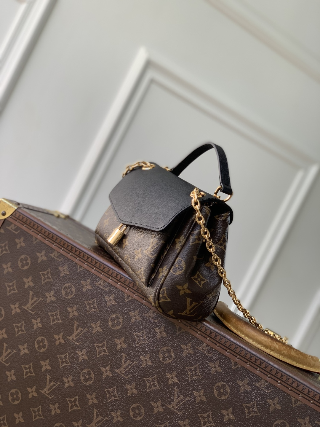 This is a replica LOUIS VUITTON M26398 Saint Germain BB. ,24 x 17 x 9 cm ,Monogram/Black,Leather and coated canvas,Leather trim,Textile lining,Aged gold-colour hardware,1 protective leather shoulder pad,Magnet closure,2 snap buttons,1 padlock,1 exterior pocket,1 flat inside pocket,Fits 6.7-inch smartphone, earphones, Rosalie Coin Purse, lipstick,Chain: Sliding, non-removable,Chain Drop: 32.0 cm,Chain Drop Max: 57.0 cm