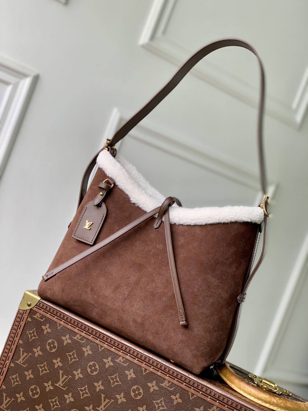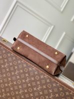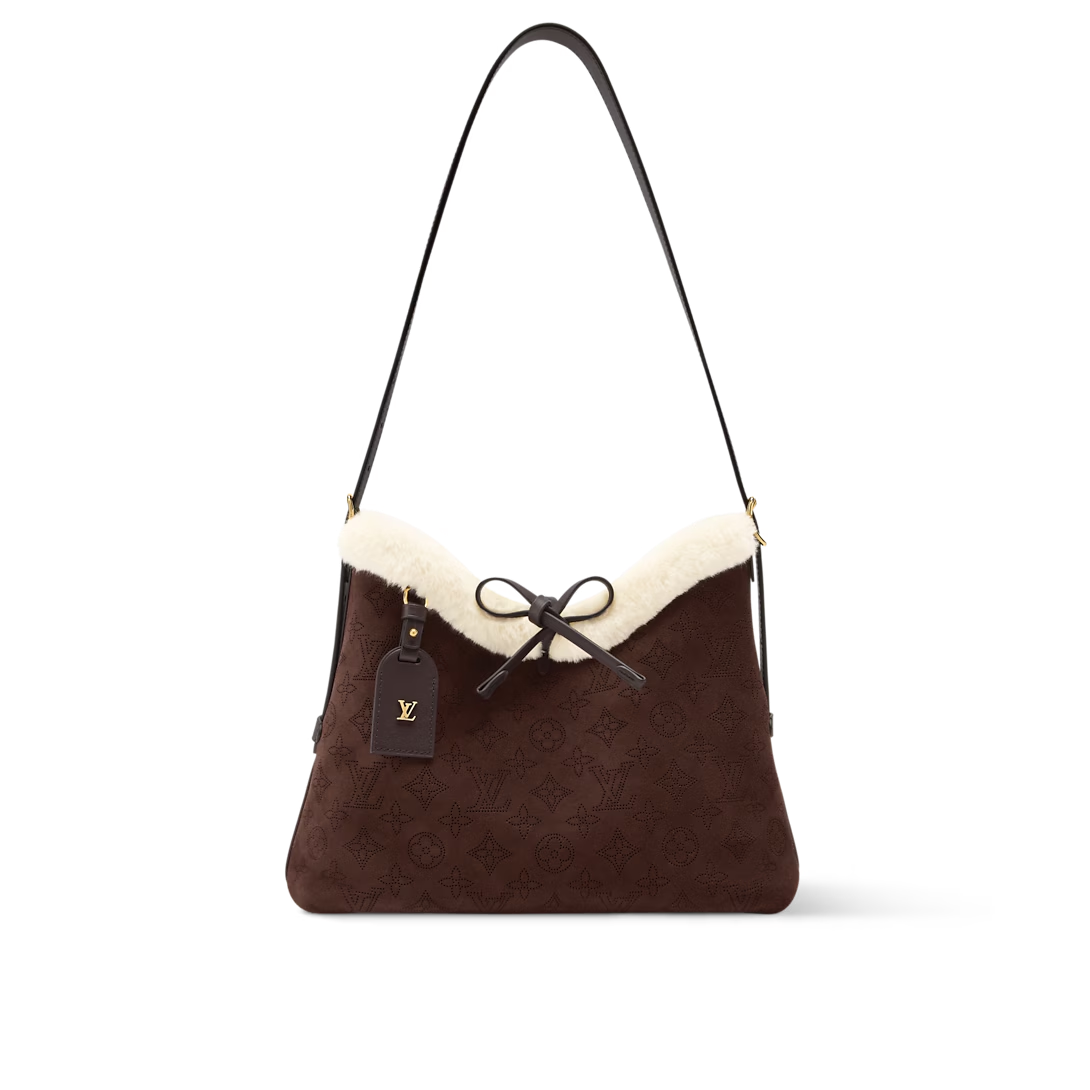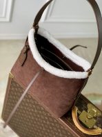This is a replica LOUIS VUITTON M26421 CarryAll PM. ,22 x 34 x 11 cm ,Chocolate Brown,Suede calfskin and shearling,Cowhide leather trim,Microfibre lining,Gold-colour hardware,Leather lace and magnet closure,2 small flat inside pockets,Zipped inside pocket,1 name tag,Fits 14-inch smartphone, earphones, Zippy wallet, keys,Strap: Removable, adjustable,Strap Drop: 42.0 cm,Strap Drop Max: 55.0 cm,Handle: Single x2