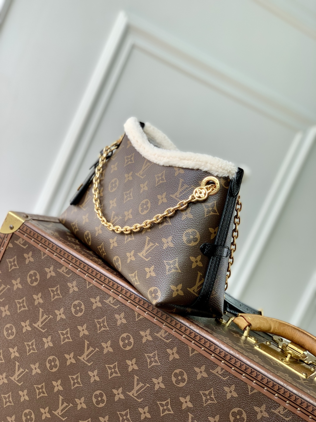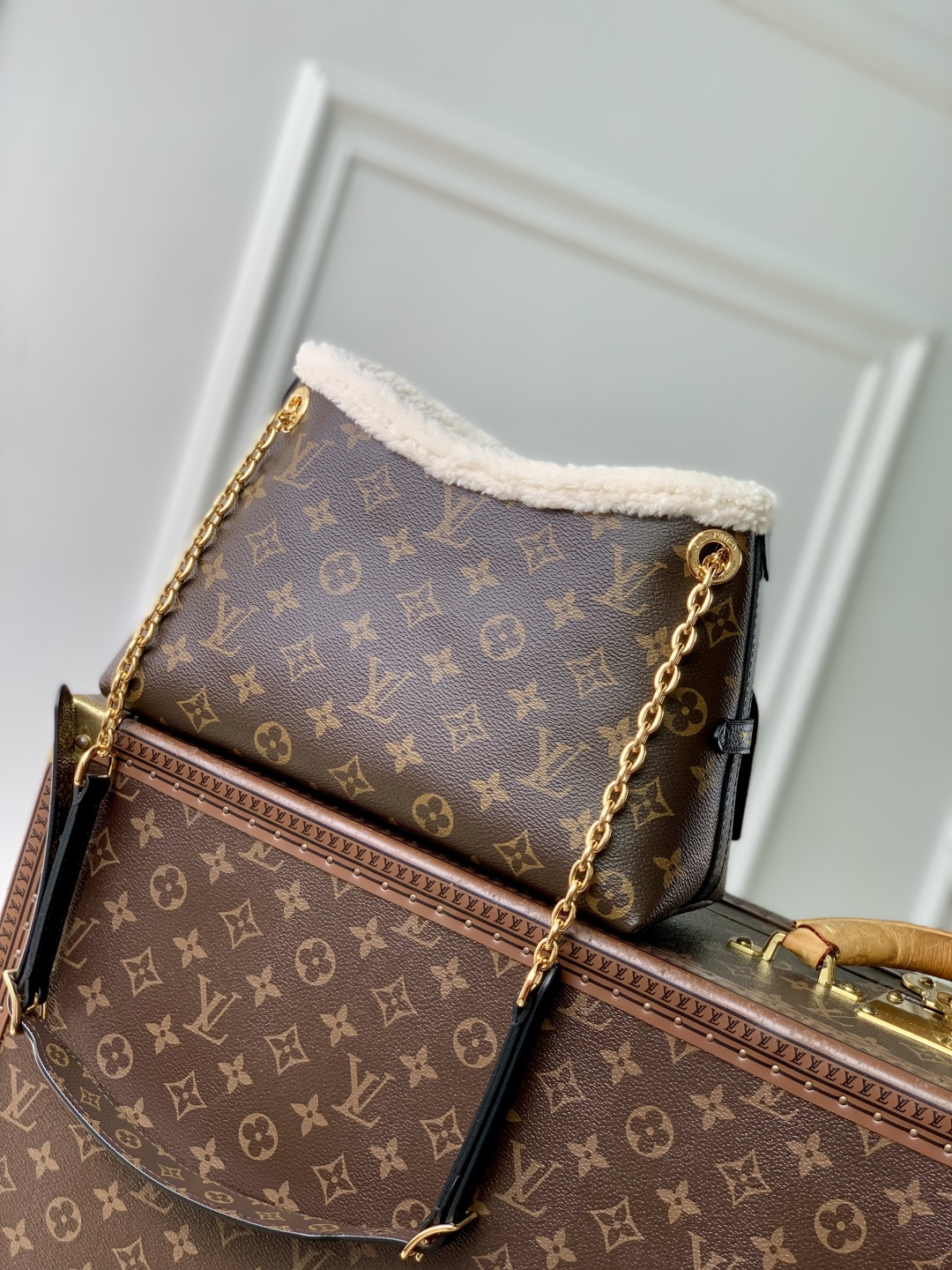 This is a replica LOUIS VUITTON M26568 CarryAll BB. ,26 x 17 x 10 cm ,Monogram shearling,Leather,Microfibre lining,Aged gold-colour hardware,Magnetic closure,1 name tag,Fits 6.7-inch smartphone, earphones, Zippy wallet, keys, lipstick,Strap: Non-removable, adjustable,Strap Drop: 40.0 cm,Strap Drop Max: 50.0 cm,Handle: Single, removable