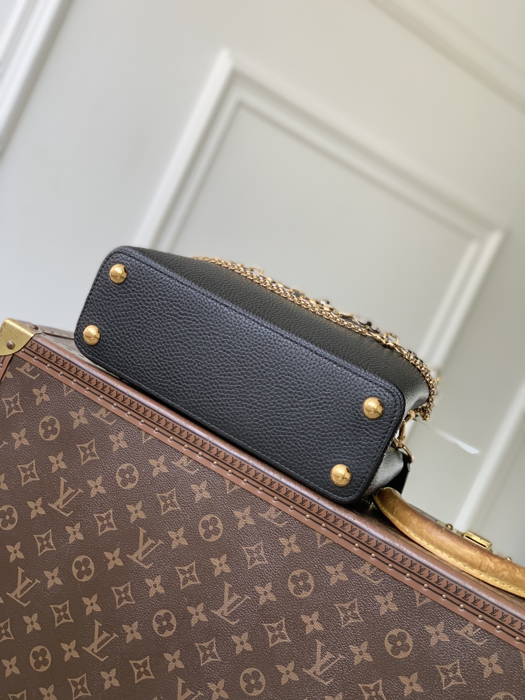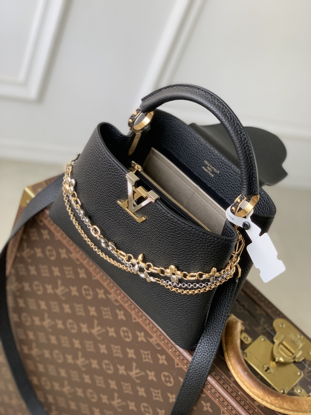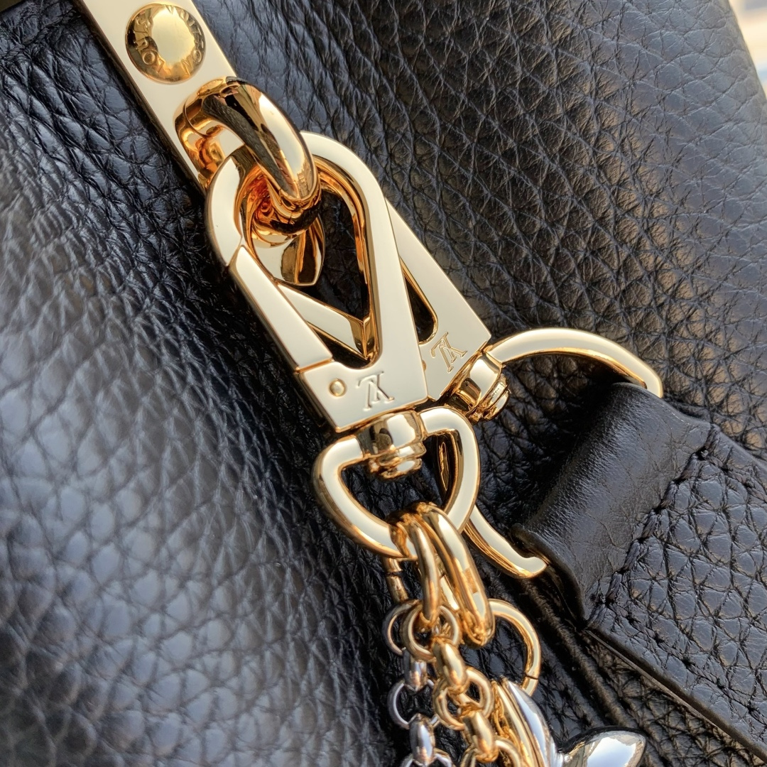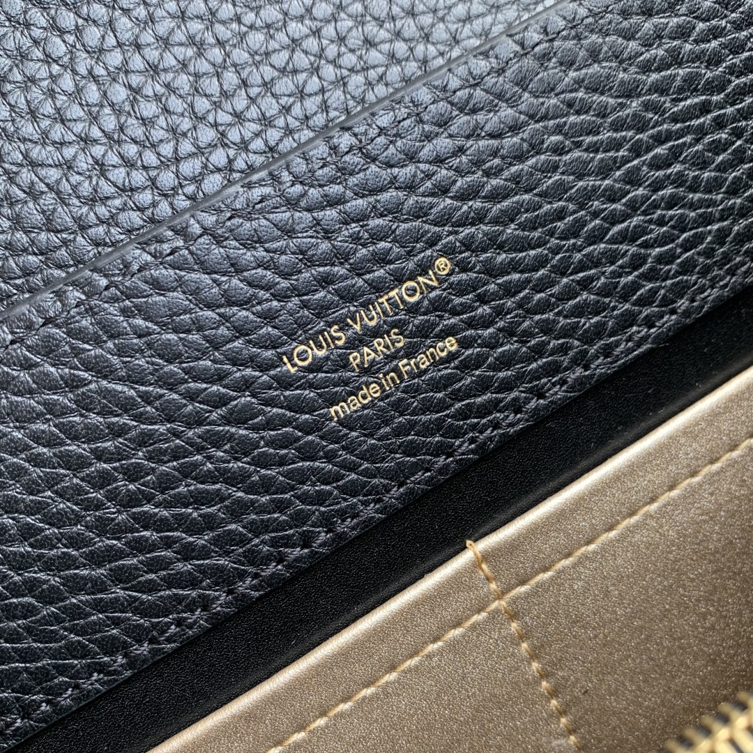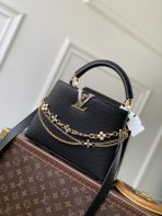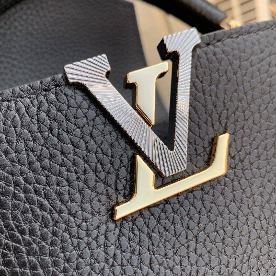 This is a replica LOUIS VUITTON M27035 Capucines MM. ,31.05 x 20 x 11 cm ,Black,Taurillon leather,Taurillon leather trim,Cowhide leather lining,Gold- and silver-colour hardware,Double carry style: flap inside or outside,Compartmented interior with 1 zipped pocket and 2 flat pockets,4 protective metal base feet,Fits smartphone, earphones, LV Vertical wallet, small makeup bag, keys,Strap: Removable, adjustable,Strap Drop: 45.5 cm,Strap Drop Max: 53.0 cm,Handle: Single