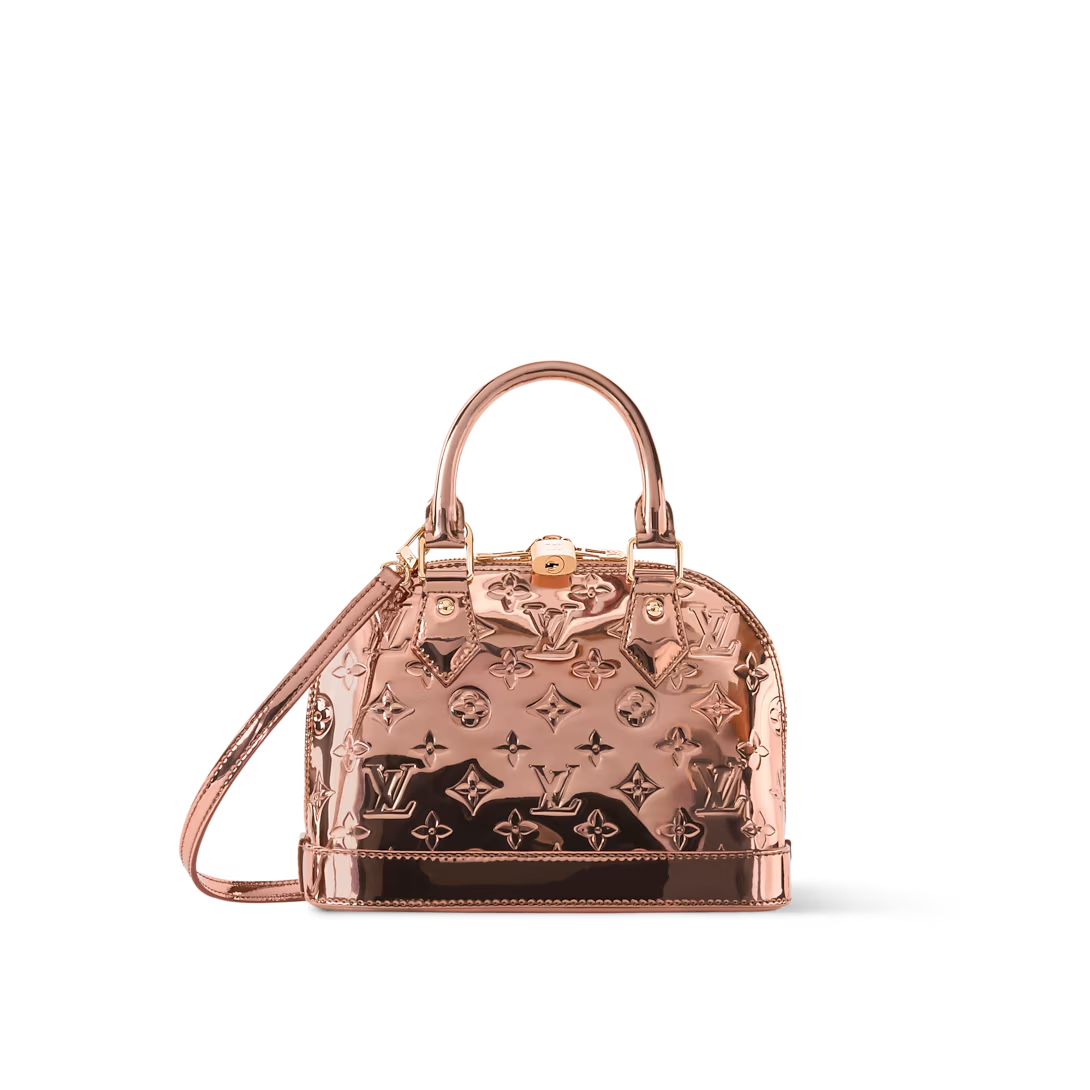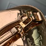 This is a replica LOUIS VUITTON M27037 Alma BB. ,23.5 x 17.5 x 11.5 cm ,Copper,Coated canvas,Coated canvas trim,Textile lining (cotton and polyester),Rose gold-colour hardware,Double zip closure with padlock,1 inside flat pocket,Fits 6.7-inch smartphone, earphones, sunglasses, keys, lipstick,Strap: Removable, non-adjustable,Strap Drop: 52.0 cm,Handle: Single x2