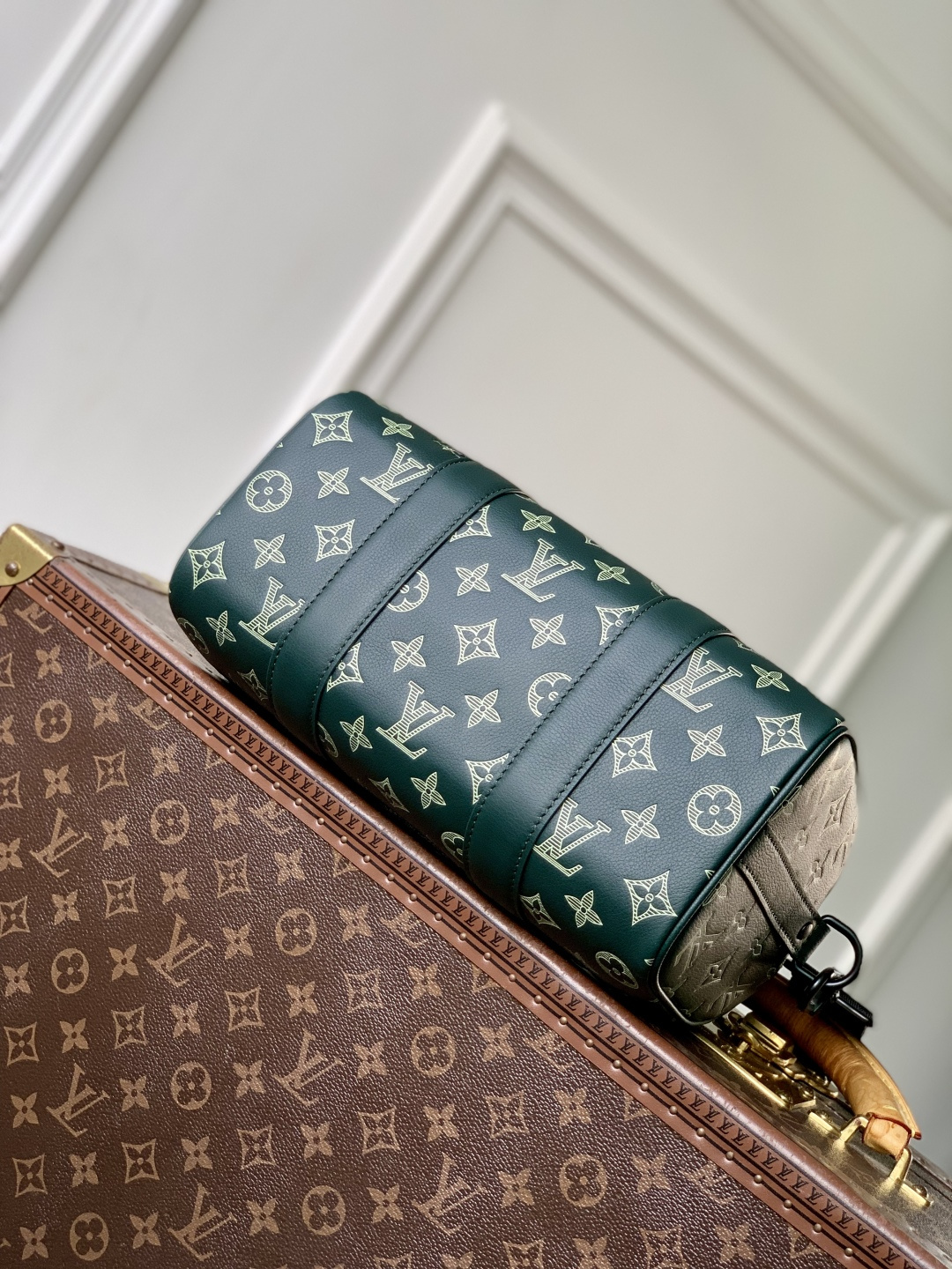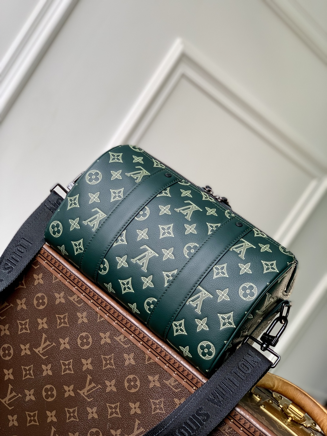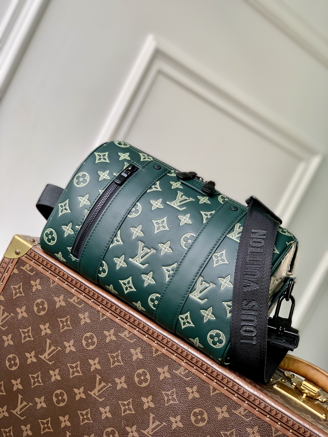 This is a replica LOUIS VUITTON M27184 City Keepall. ,27.5 x 16.5 x 15 cm ,Forest Green,Monogram Shadow calf leather,Calf leather trim,Textile lining,Black-colour hardware,Double zipped closure,Large main compartment,Zipped front pocket,Strap: Removable, adjustable,Strap Drop: 33.5 cm,Strap Drop Max: 66.0 cm