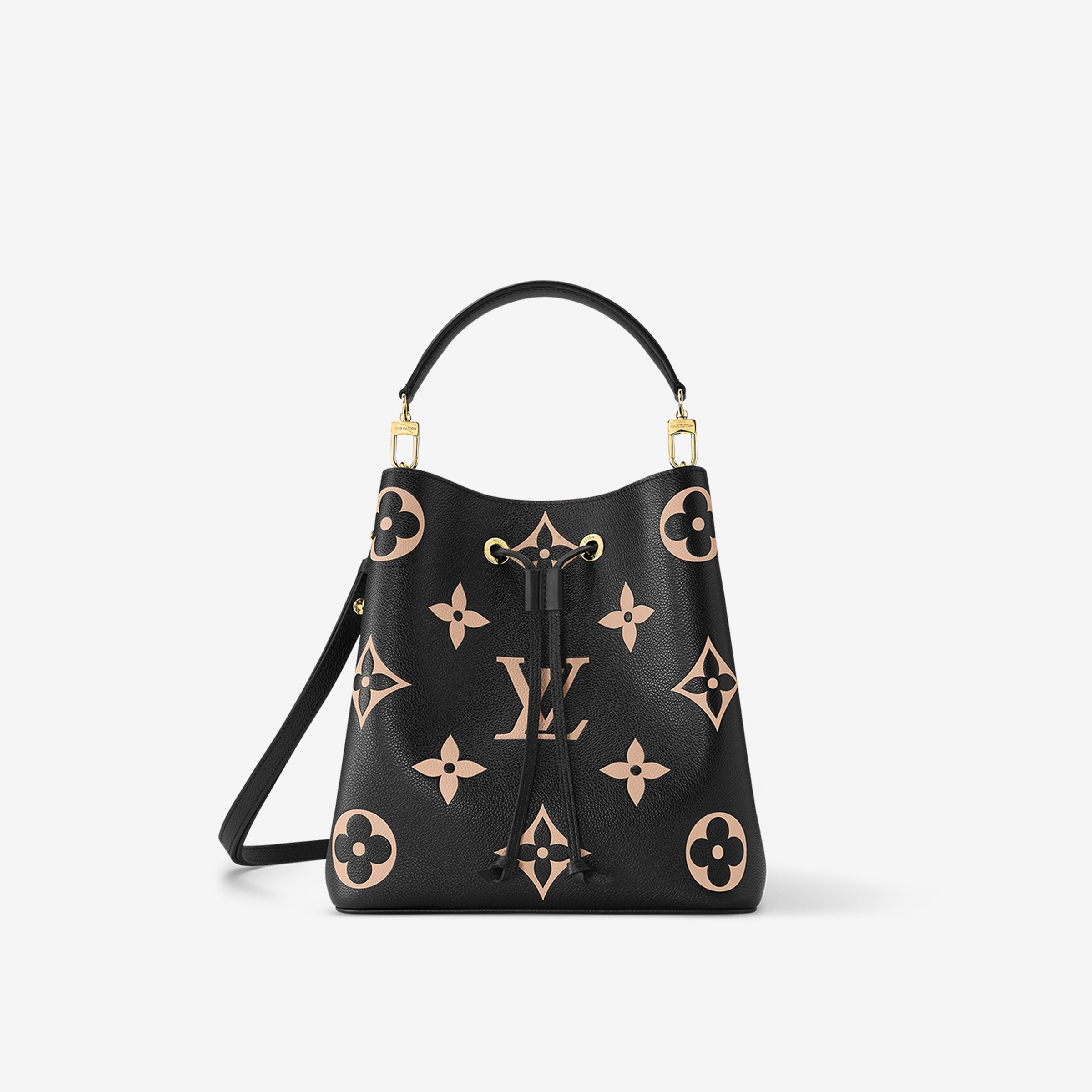 This is a replica LOUIS VUITTON M45497 NéoNoé MM. ,10.2 x 10.2 x 6.9 inches ,Black/Beige,Embossed grained cowhide leather,Grained cowhide-leather trim,Microfiber lining,Gold-color hardware,Zipped central pocket,2 compartments,Metal eyelets,Fits: Smartphone, Victorine wallet, tissue, lipstick, earphones, keys,Weight: 0.9 kg,Strap:Removable, adjustable,Strap drop:12.2 inches,Strap drop max:21.3 inches,Handle:Single, removable