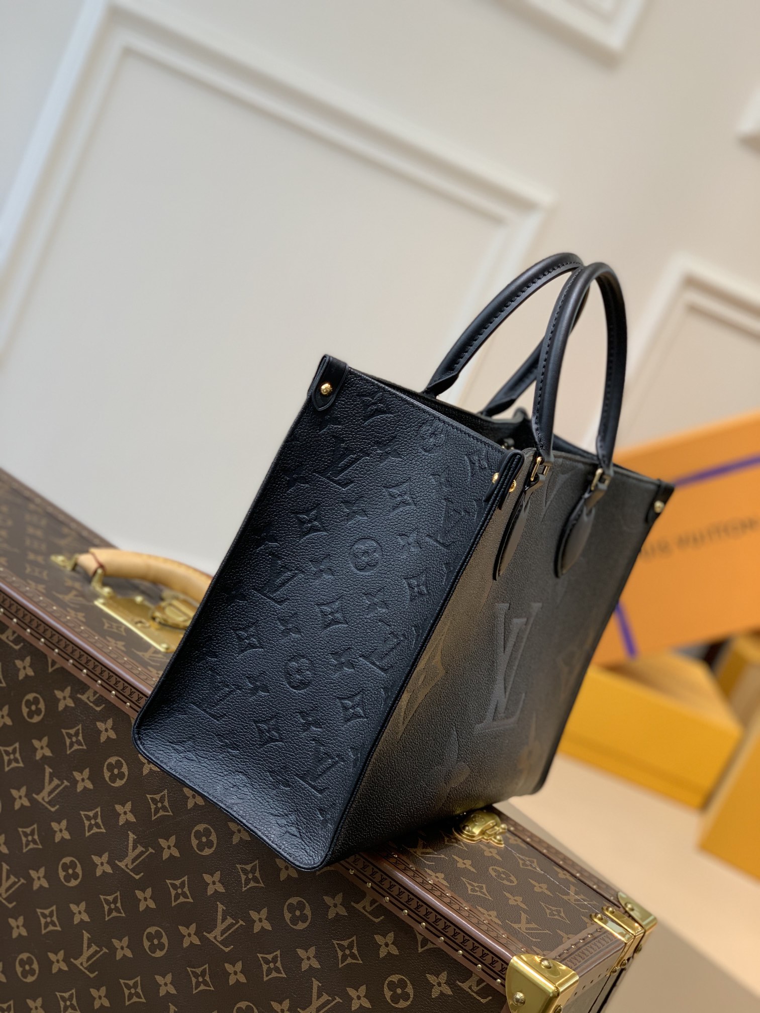 This is a replica LOUIS VUITTON M45595 Onthego MM. ,13.8 x 10.6 x 5.5 inches ,Black,Embossed grained cowhide leather,Grained cowhide-leather trim,Microfiber lining,Gold-color hardware,Inside flat zipped pocket,Inside double pocket,2 long leather shoulder straps (drop: 24 cm),Fits: 13-inch laptop, smartphone, keys, Zippy Long Wallet, earphones,Handle:Double