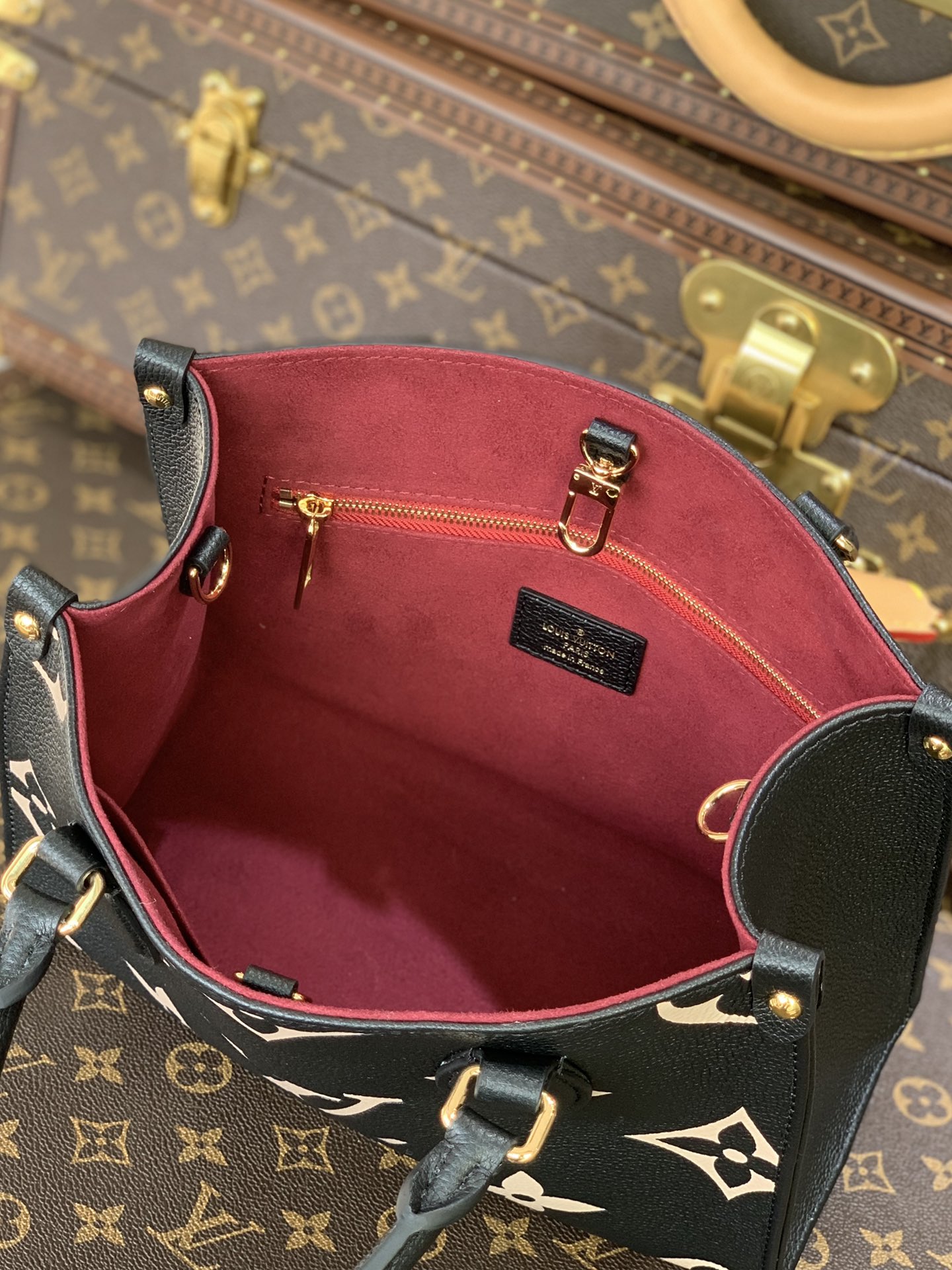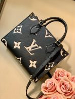 This is a replica LOUIS VUITTON M45659 OnTheGo PM. ,9.8 x 7.5 x 4.5 inches ,Black/Beige,Embossed grained cowhide leather,Grained cowhide leather trim,Microfiber lining,Gold-color hardware,Inside flat zipped pocket,Inside double pocket,4 riveted corner tabs,Fits: Smartphone, Sarah Long Wallet, keys, lipstick, tissues, small book,Strap:Removable, adjustable,Strap drop:18.9 inches,Strap drop max:20.5 inches,Handle:Double