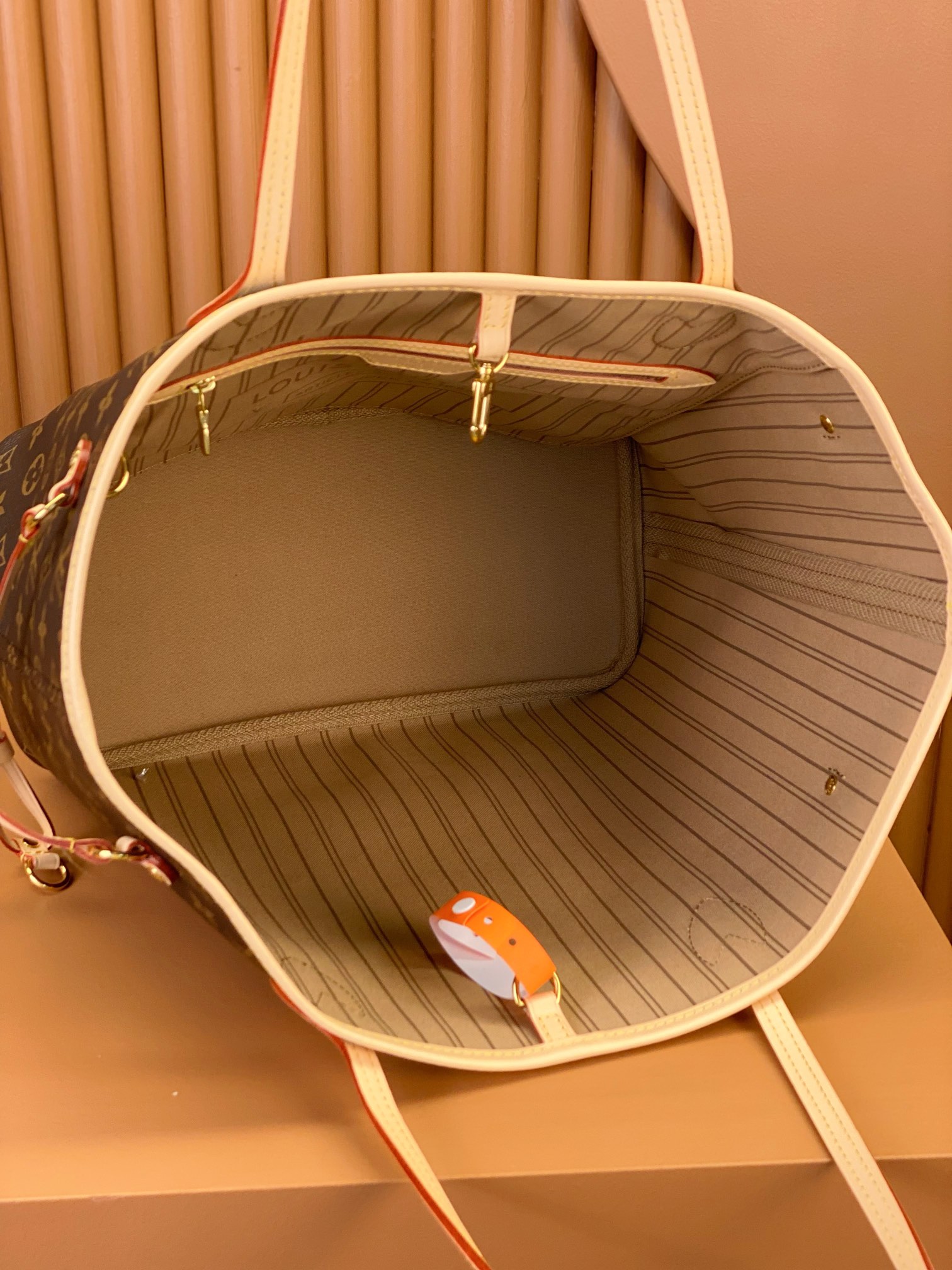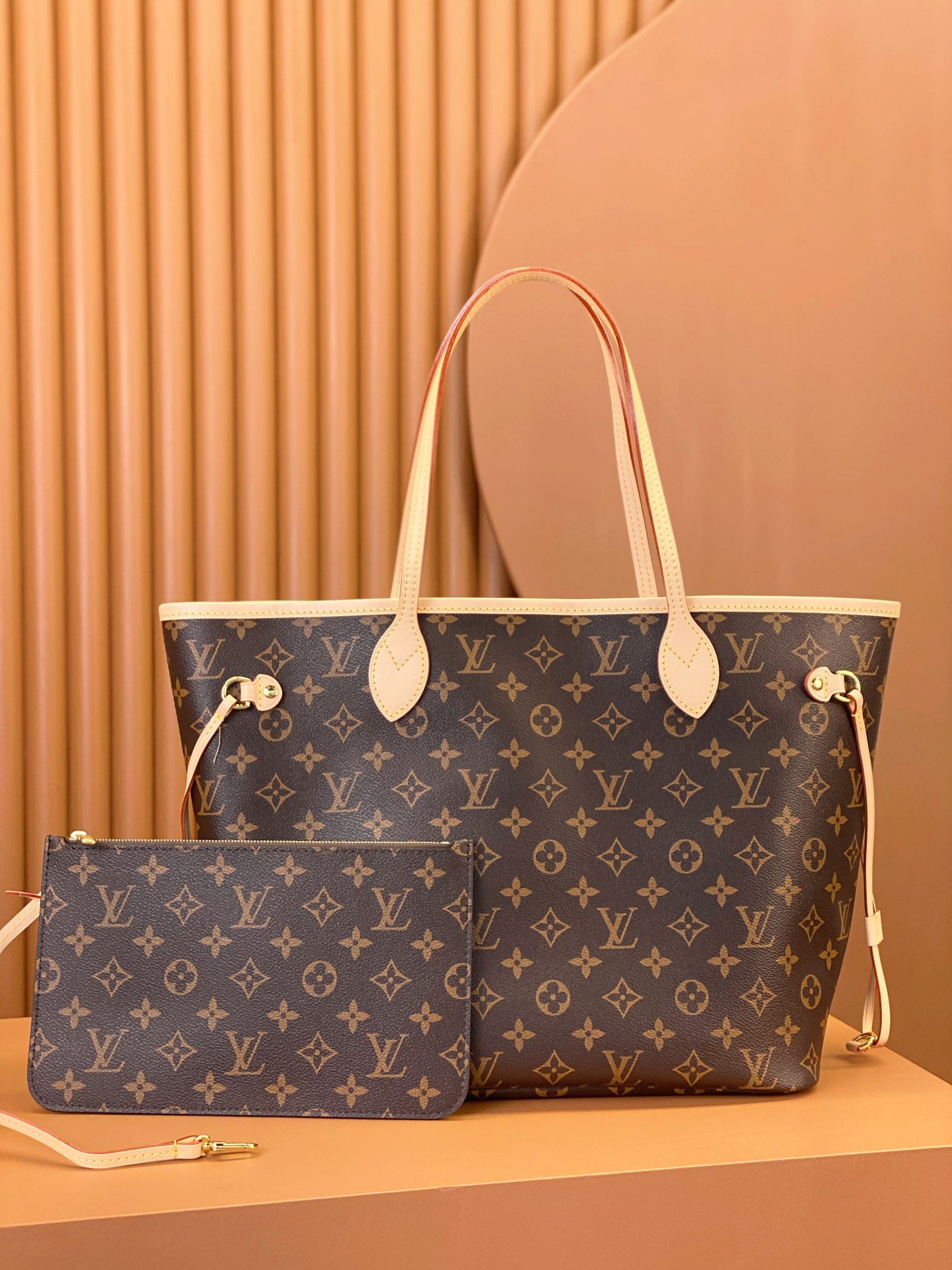 This is a replica LOUIS VUITTON M46975 Neverfull MM. ,12.2 x 11 x 5.5 inches ,Beige,Monogram coated canvas,Natural cowhide-leather trim,Striped textile lining,Gold-color hardware,4 side laces,Hook closure,Flat, textile-lined zipped inside pocket,Removable zipped pouch,D-ring,Fits: 13-inch laptop, Smartphone, keys, Zippy wallet and earphones,Weight: 0.8 kg,,Handle:Double