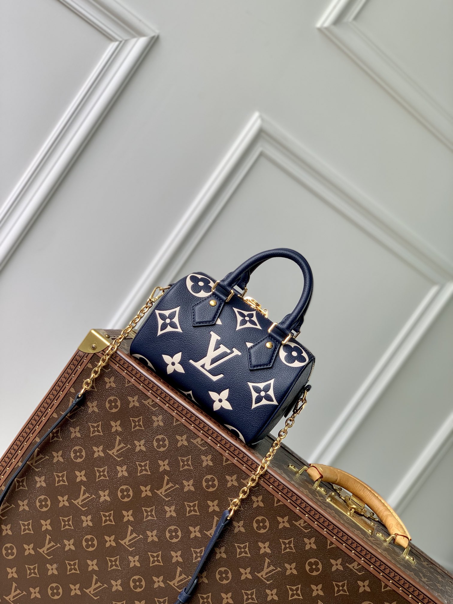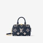 This is a replica LOUIS VUITTON M47048 Speedy Bandoulière 20. ,8.1 x 5.3 x 4.7 inches ,Navy Blue/Cream,Monogram Empreinte embossed grained Cowhide leather,Grained-cowhide-leather trim,Microfiber lining,Gold-color hardware,Large inside flat zipped pocket,1 inside flat pockets,Padlock,Fits: 6.7-inches smartphone, Lou Compact Wallet, keys, tissues, book, sunglasses, lipstick,Strap:Removable, adjustable,Strap drop:19.3 inches,Strap drop max:21.3 inches,Handle:Double